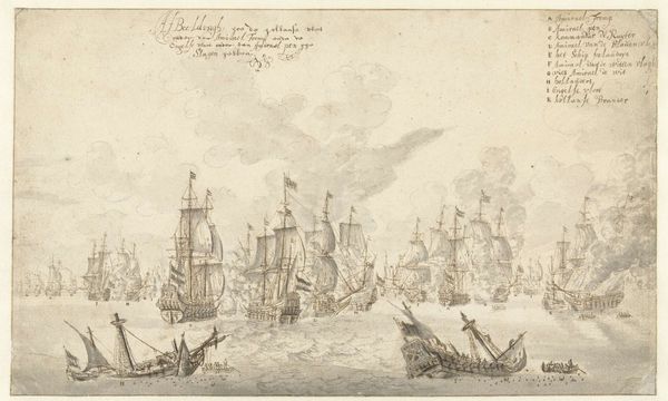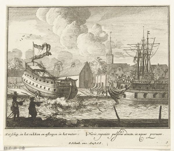 This print, made around 1700 by Sieuwert van der Meulen, shows the laborious process of maintaining a ship. It’s made using etching and engraving, techniques that allow for fine detail and a wide distribution of images on paper. The image depicts a ship being careened, turned on its side to allow for the hull to be caulked and sealed with pitch. This was essential for ocean-going vessels, constantly battered by seawater and prone to leaks. Notice the workers swarming around the ship – their collective labor was vital for the maritime economy of the Dutch Golden Age. The print itself serves as a document of this process, a testament to the skilled labor involved in shipbuilding and maintenance. It reminds us that even the grandest ships relied on human ingenuity and effort. Looking closely, we can appreciate how this image transcends the boundaries of fine art, offering valuable insight into the social and economic context of its time.