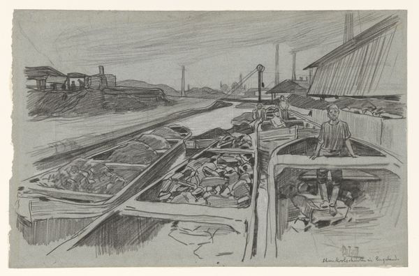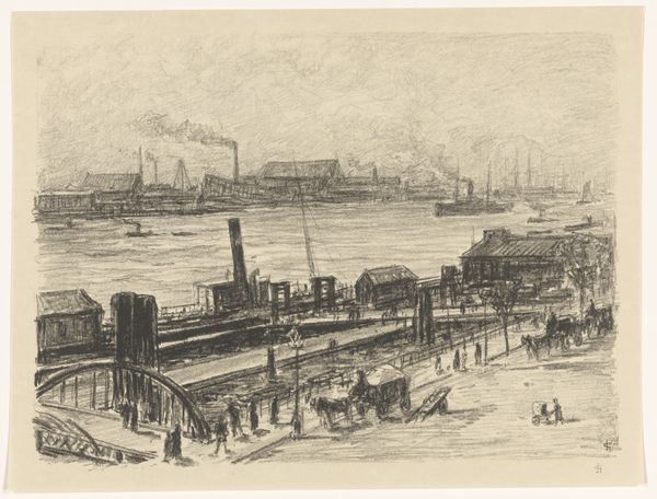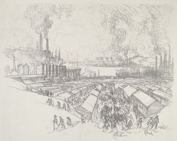 Curator: This evocative print is titled "In the Land of Iron and Steel," rendered in graphite by Joseph Pennell around 1916. A visual poem, really, of the industrial age. Editor: My first breath when looking at it—smog, soot. It’s sooty, but also strangely beautiful. Those delicate lines hinting at such a brutal landscape… I find it compelling. Curator: Pennell's work frequently captures this tension. The billowing smoke, the skeletal factory structures. In Jungian terms, it evokes the Shadow – the disavowed, often destructive side of progress. Notice how the railway lines seem to dominate. Editor: Yes, they slice through the landscape, directing your gaze relentlessly into that industrial heart. The repetition of the chimneys – almost totemic. It’s almost… worshipful. I wonder about that intentionality. Curator: Interesting you mention worshipful… Many critics saw these industrial scenes, especially during wartime, as celebratory of American might. Pennell wasn’t immune to such interpretations, but I believe his true aim was more ambiguous—acknowledging power, maybe, but never truly glorifying it. Look at the scale—human figures are practically absent. Dwarfed. Editor: The near absence of figures is really what amplifies the crushing effect of industry—like ants before the giants. You know, even the signature seems hesitant. Curator: You’ve hit upon something there, I think. Pennell’s career straddled aesthetic movements; this work carries both the realistic detail yet also the emerging modernist sensibilities. It reflects that moment where humankind stood awestruck, but perhaps also terrified, at what they had wrought. Editor: Yes, definitely terror mixed into the awe—the land itself seems subjugated beneath that network of iron. We can almost feel the ground vibrate. What symbols of hope would he show next? Curator: Good question! Though here, he's revealed, even in industry’s monstrous form, a certain terrible sublimity. Perhaps even in the smoke and the smog there lies a kind of bleak beauty... Editor: Absolutely, I walk away reflecting how the symbols themselves were in transition. Steel: brutal force or burgeoning opportunity? This print feels timeless in that dilemma.