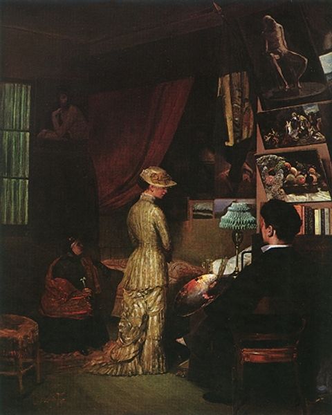 Vladimir Makovsky created this painting, known as 'Two Sisters,' in Russia. Here, we see a snapshot of Russian social life, probably in the late 19th century. The fashions and interior speak to the realities of class difference. The older sister, dressed in finery, appears to be bringing bad news to her family: her father sits despondently at his desk, as the other sister looks on, with an elderly woman watching from the doorway. Makovsky was part of a movement called the 'Peredvizhniki,' or 'Wanderers,' who aimed to depict Russian life critically and realistically. His paintings offer us a glimpse into the social dynamics of the time, marked by disparities in wealth, rapid modernisation, and a deep questioning of social norms. To truly appreciate this painting, we might delve into Russian literature and social commentary of the period. Works by authors like Chekhov and Tolstoy offer a window into the complex interplay of social classes. By studying these sources, we can better understand the social context of this painting and the artist’s critical approach to art.