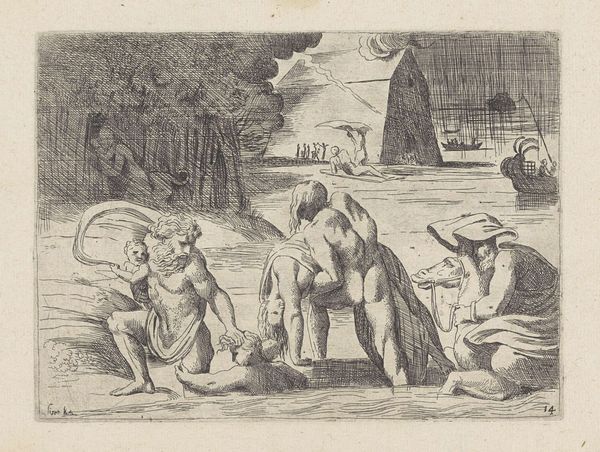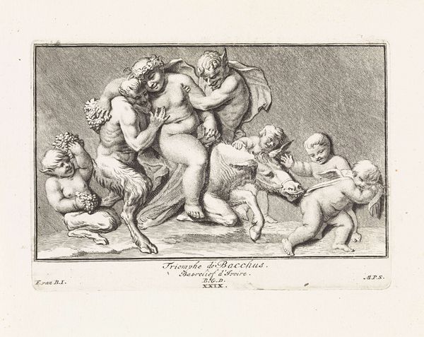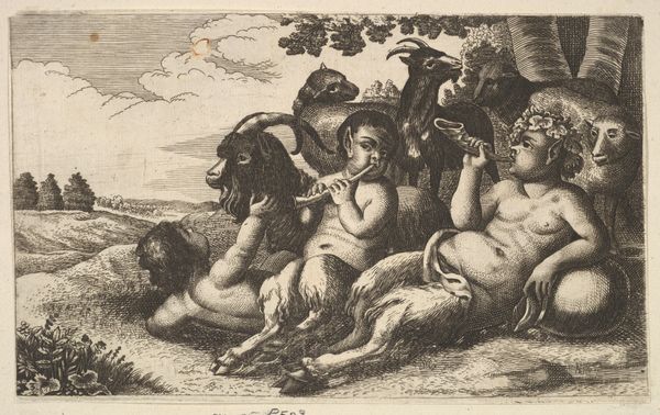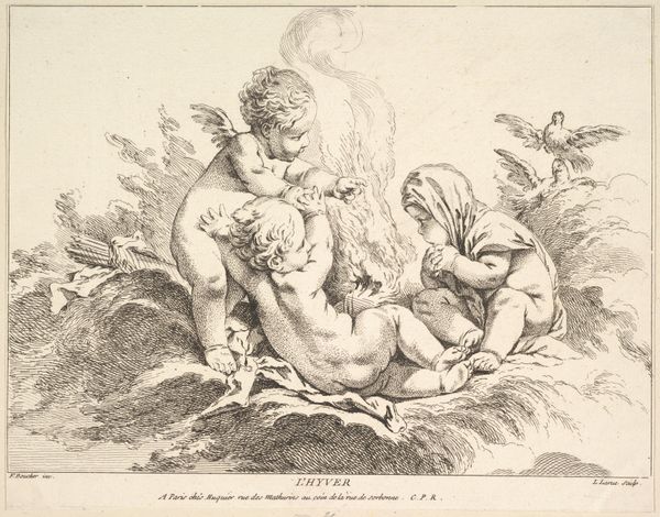 Bernard Picart created this print, "Three Putti with Attributes of the Muses," around 1715, using etching. During the Enlightenment, the classical world experienced a rebirth. Picart situates his three putti, or cherubic boys, amongst the clouds, and they carry the objects associated with the arts of classical mythology. At the center, one holds a dramatic mask, which represents theatre, and a laurel wreath, symbolising victory. The other two hold a trumpet and drum sticks, alluding to music. These symbols, while celebrating male artistic genius, tend to exclude women. The muses, the embodiment of artistic inspiration, are female, yet here we see only young boys. As we consider this image, what does it mean to depict art as the province of childhood? Do these images resonate today, and if so, how do they shape our cultural landscape?