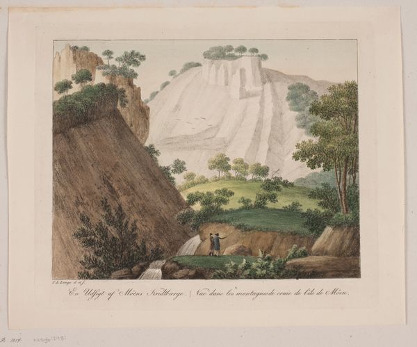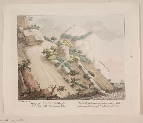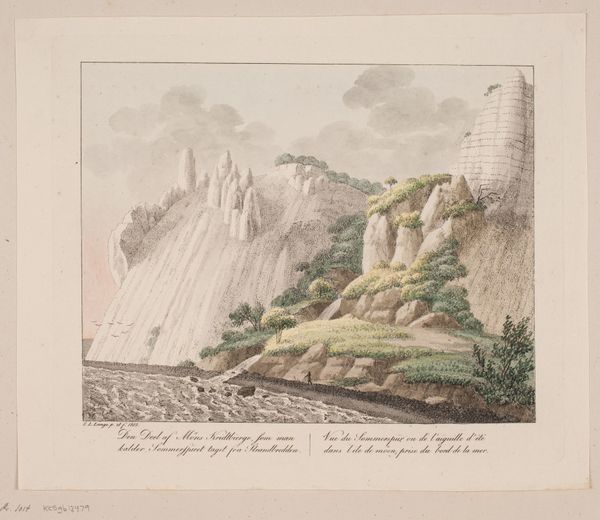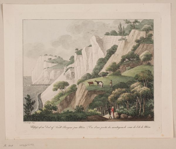 Søren L. Lange made this print of Møns Klint, Denmark, using etching and engraving. The image presents a romanticized vision of the natural world, reflecting the cultural values of the late 18th and early 19th centuries. The dual language inscription, Danish and French, indicates the artwork's intended audience among the educated elite, aligning with the period's emphasis on reason and order. Consider how landscape art, particularly depictions of the Danish countryside, served to reinforce a sense of national identity, during a time of political upheaval. The presence of figures and livestock amidst the dramatic cliffs could evoke a harmonious relationship between humanity and nature, subtly reinforcing social hierarchies. Examining sources from the Danish Royal Academy of Fine Arts can shed light on the artistic training and prevailing aesthetic ideals that shaped Lange's work. The role of institutions in shaping artistic styles is critical in the study of art history.