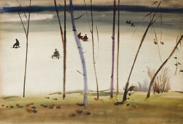 Petros Malayan created this watercolor painting of the Moscow suburbs, and its dimensions are 64 by 91.5 centimeters. Here, the composition is divided into distinct horizontal layers: the sky, land, and foreground each occupy a significant band, creating a structured yet serene landscape. The atmospheric perspective blurs the background, drawing our focus to the more defined elements in the foreground, such as the solitary figures and stark trees. These elements aren't merely representational; they function as structural components that guide the viewer's eye through the piece, creating a visual rhythm. The cool, muted tones, dominated by blues and greys, evoke a somber, almost melancholic mood. The contrast between the soft, diffused washes of the sky and the sharp, vertical lines of the trees creates a visual tension, reflecting a broader engagement with the interplay between natural forms and constructed space. Malayan's formal choices invite us to consider how these elements interact to evoke a sense of place, memory, and existential reflection. The simplicity of the watercolor medium lends itself to exploring subtle nuances of light and shadow, transforming a seemingly ordinary landscape into a meditation on form and feeling.