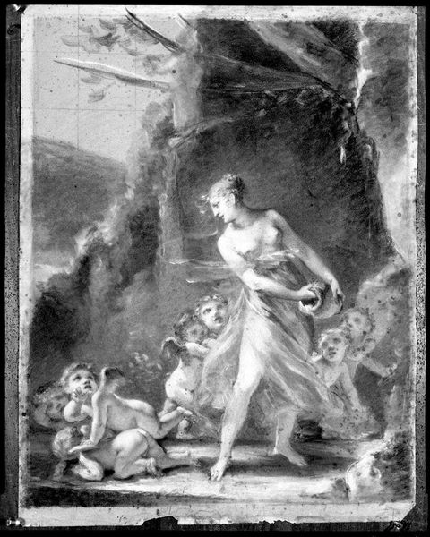 Editor: This is Giovanni Battista Piranesi's "Orpheus," a drawing done in ink. The figures seem caught between worlds; some are grounded in reality, while others ascend into a more ethereal plane. What's your read on this complex composition? Curator: I see a potent commentary on power and the artist's role within oppressive structures. Orpheus, traditionally a symbol of harmony and persuasion through art, is here rendered almost powerless before a panel of seemingly callous judges. Look at the seated figures: are they lawgivers, philosophers, or simply the elite? And consider who they are judging. Is it merely Orpheus, or art itself? Editor: That’s a very interesting way to think of it! I was focused on the two different planes: the grounded figures with their harsh judgment, contrasted with this…ascent. Is Piranesi suggesting art’s capability to transcend such constraints, perhaps into a form of liberation? Curator: Exactly! The swirling figures above are reminiscent of both classical allegories and contemporary social struggles. Is Orpheus's music freeing them from their earthly bonds? Or does that "freedom" reinforce existing power dynamics? Consider how Orpheus is portrayed as physically separate, his power perhaps neutralized, even as he performs. We must question whether the artistic and intellectual elites he plays for represent a truly benevolent force. Editor: I never thought about it in terms of power before! I’d only really seen it in the context of Neoclassical style and mythology. I guess I thought of the seated men more as classical philosophers or ancient thinkers rather than powerful elite. Curator: That is the magic of art! Its ambiguity forces us to think about how historical interpretations change over time, influenced by prevailing ideas of social justice, oppression and freedom of speech. Maybe these are indeed the classical philosophers, as you stated, and not 'powerful elites'. Editor: Right! I’m understanding how our own assumptions, shaped by today’s world, impact how we view even historical artworks. Thanks for a great new insight! Curator: My pleasure!