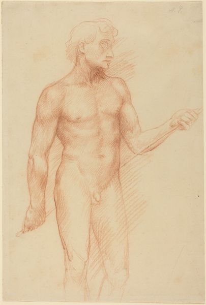 Editor: This pencil drawing by Richard Nicolaüs Roland Holst, called "Wijdbeens staande man met ontbloot bovenlichaam 2," is striking. The sketchiness gives it a sense of immediacy. What social or cultural factors do you think influenced its creation? Curator: That's an excellent question. Holst was active during a time when academic figure drawing was shifting. The body, and particularly the male nude, held immense cultural weight. Traditionally, it symbolized power, beauty, and idealized forms stemming from classical ideals promoted through art academies. But the social climate was starting to allow for a broader scope in how artists chose to view the figure. What is *your* take on the male figure drawings circulating in the Netherlands around that period? Editor: I see the emphasis on anatomy in academic circles. It’s evident here but softer and more gestural. I feel there’s a departure from rigid classical depictions. Curator: Precisely. The rise of various social movements prompted artists to re-evaluate and express a newfound understanding of masculinity and representation through artworks. How did that context influence Holst's creation and his standing amongst the other Dutch artists of the period? Editor: Knowing that gives me a totally different perspective. It shows how social movements might lead to evolving tastes and views of the arts. Curator: Exactly! Examining art through this lens is really helpful. I see these art pieces less like individual masterpieces, but rather as cultural artifacts produced at a given point in history by artists impacted by larger institutional and societal movements. It shapes their interpretation and understanding. Editor: I'll definitely approach artworks differently going forward, thinking more about historical context and socio-political considerations!