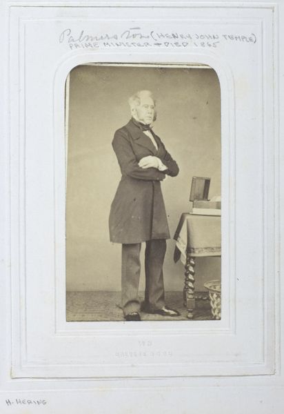Editor: This is "Portret van een zittende man aan een tafel, aangeduid als Fosfordeux," created sometime between 1855 and 1870 by W. (I) Mayer. It looks like a photograph, almost sepia-toned. It’s really intriguing… there's something so posed and deliberate about it. What do you see in it? Curator: It is compelling. Note how the photographer, Mayer, would have been engaged in both science and art to produce this image. The toned paper and hand-printed aesthetic indicate a deliberate crafting process, one that attempts to reconcile art's creative production with industry, revealing 19th century social context and artistic consumption, no? Editor: That's fascinating. I hadn't considered the labor involved. It’s easy to forget about the material processes behind photography, thinking about them as somehow "less crafted." Curator: Exactly. What labor was involved in the selection of materials? Was this photographic process easily available? Were these photographs commonplace or luxury objects? Photography, even early on, blurred the lines between reproducibility and high art. Note too, the staging involved, which elevates the subject. How would staging contribute to consumption and the production of artistic value? Editor: So, even in what appears to be a straightforward portrait, the means of production – the choice of materials, the printing process, even the staging – played a significant role in how it was perceived and valued. Curator: Precisely. And what did photography mean to labor practices? Were painted portraits suddenly obsolete, and what would have been the impact? How would such a new medium alter how portraits as objects would be acquired? Editor: It's interesting to consider the economic impact and the shift in artistic labor it would create. Thank you, I’ll never look at old photos the same way! Curator: The material informs the context; the context, the making; the making, the object’s role in a culture of material consumption.