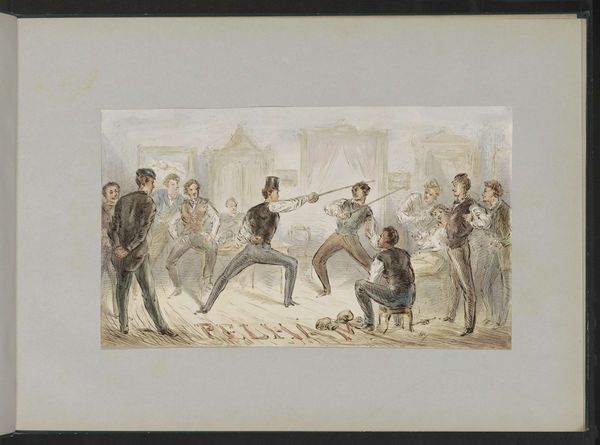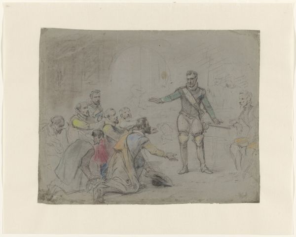 Curator: Let's discuss this striking work, "Man met een afgehakt hoofd in een menigte" ("Man with a severed head in a crowd") by Alexander Ver Huell. It's estimated to be created sometime between 1854 and 1887. It is currently held in the Rijksmuseum. Ver Huell worked in ink and coloured pencil to bring this turbulent image to life. Editor: The initial feeling is visceral, almost shocking. It has this air of frantic energy and rebellious uprising in its frenzied depiction. The starkness is intriguing but, certainly disturbing. Curator: Considering the historical context, this work probably mirrors revolutionary unrest occurring at the time, perhaps referencing the French Revolution’s imagery. The depiction of a severed head serves as a powerful, albeit brutal, symbol of rebellion against authority and speaks to the material realities of violence and revolution. The means justify the ends, you know? Editor: Right. And I'm drawn to think of the social underpinnings—who are these figures? Are they acting for liberty, and for whom? We cannot ignore the gendered and racial dimensions of revolutions, as some gain freedom while others do not. Who would wield this head in such a circumstance? Curator: Thinking of its materiality, look at the use of ink and colored pencils; rather common tools that create art with potent political themes, therefore challenging our perceptions of “fine art” from such turmoil. Notice the almost rushed application. Editor: Yes, that rushed aesthetic suggests an urgency, a need to document and convey the chaotic energy of a populace in revolt. This reminds me how art production itself can become a form of resistance, circumventing more heavily controlled media and speaking truth to power. Curator: And isn't there an irony in this display of raw human emotion created using such accessible, common materials like colored pencil and paper? The simplicity underscores the accessibility of revolution to the masses. Editor: I agree. Thinking about this piece really pushes us to contemplate the different layers of struggle, violence, and revolution captured within an ostensibly simple drawing. It forces a needed dialogue between past unrest and modern struggles for equity and self-determination. Curator: Absolutely. A closer analysis reveals the multifaceted dimensions, from raw materials to layered meanings behind an object, seemingly simplistic, made available by common supplies to any citizen in this revolutionary time.