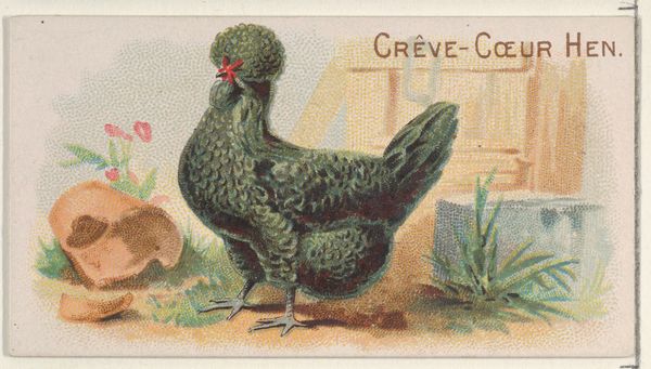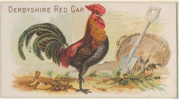 This is "Brown-Breasted Red Game Cock" a lithograph created for Allen & Ginter Cigarettes. What strikes you immediately is the composition—a proud rooster centered, stark against a soft, almost hazy backdrop. The textures are intriguing; the rooster’s feathers seem to bristle with life, contrasting with the gentle washes of color in the landscape. Consider the rooster as a sign, imbued with cultural codes of virility and aggression. The image, produced for a cigarette brand, taps into these associations, subtly linking them to the act of smoking. But there's a tension here. The delicate lithographic technique and muted palette soften the rooster's inherent power. This creates a disjunction. Is it a celebration of nature, a symbol of masculine prowess, or a commentary on the artifice of advertising? Perhaps it's all these things, layered one over the other, destabilizing any fixed meaning. Ultimately, this small card embodies the complex interplay between form, function, and cultural significance.