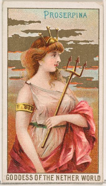 Curator: This striking print comes to us from 1889. It is part of the “Goddesses of the Greeks and Romans” series (N188) by Wm. S. Kimball & Co., currently held at the Metropolitan Museum of Art. The title, "Klotho, One of the Three Destinies, Birth," is particularly intriguing. Editor: My first thought is how ethereal it seems, despite being a print. There’s something quite poignant about the central figure, Klotho, lightly draping fabric and softly textured hair, as if caught in a fleeting moment of creation. Curator: It’s fascinating how Kimball & Co. chose to depict Klotho in this historical context. Trade cards like this one were, of course, advertisements but they also offer insight into how Greco-Roman mythology was being interpreted, popularized, and perhaps even utilized to convey societal ideals about gender roles in the late 19th century. Editor: Indeed. Look closely at Klotho herself. The thread she holds, seemingly spun from the distaff by her side, becomes the crucial visual element. Throughout different eras, the thread symbolizes life and destiny; the continuous thread, therefore, reflects the power and responsibility in determining the fate of every human life. Curator: Absolutely. Consider, too, the implications of depicting a woman—one of three, no less—as the arbiter of life’s beginnings. This portrayal is a reflection of shifting power dynamics that would have placed women as central to determining who gets born and under what circumstances. Editor: The act of spinning, which we so strongly associate with ancient femininity, is no accident here, the weaving implies creating and dictating the structure of the cosmos through visual shorthand. Curator: Precisely. Through the commercial application of this allegorical character, the art elevates a complex narrative that both reinforces established archetypes and empowers it through commercial branding. It mirrors and refracts the changing perceptions of women during this period. Editor: Looking at Klotho through the layers of her symbolism has broadened my understanding, shifting my appreciation from initial aesthetic reactions to historical and philosophical musings on our mortal coils. Curator: Agreed, it’s a delicate and multi-layered print, weaving together threads of classical mythology, Victorian ideals, and capitalist aspirations in one small, commercially distributed image.