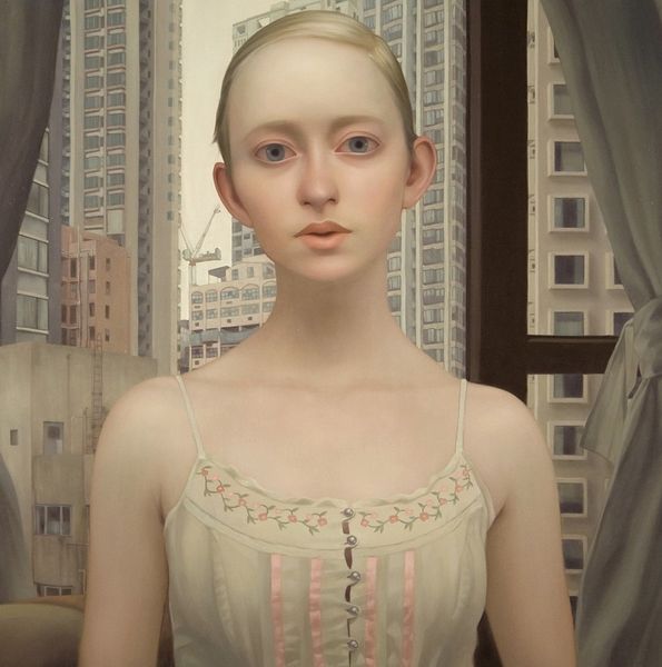 Curator: Looking at Lu Cong's painting, "My Name Is Tabitha," painted in 2010, I'm struck by its quiet intensity. Oil on canvas, classical style but also incredibly present, you know? Editor: Present, yes, but there’s an unsettling stillness to it. It's photorealistic, bordering on hyperreal, with almost a waxen quality to the figure. It's captivating, though. Curator: Right? Her expression seems so closed off, yet her eyes invite something else in... Lu Cong is a master of that tension. What does this all mean, I wonder? Or am I reading too much into a face? Editor: Not at all! It’s there in the composition. The formality of the pose – seated, hands clasped – clashes with the softness of her hair and that floral wallpaper, creating a visual dissonance. The pattern itself becomes almost a suffocating presence. Curator: Precisely. And the white of her shirt is like a stage for us to wonder about who she is. Is it innocence, constraint... or both? The wallpaper clashes delightfully like an unwelcome memory in my head. And, yet, such tenderness and beauty are being presented... Editor: A careful study of contrasting elements, then, the calculated juxtaposition of textures. There's real tension in the layering of forms – the precise rendering of folds in the fabric versus the almost dreamlike quality of the background, where she is also clearly embedded. Curator: It does raise questions about identity, doesn’t it? About presentation, vulnerability. The flowers – stylized and almost floating – provide this whole story that never gets written on a canvas so beautifully painted as this. And then comes the title – "My Name Is Tabitha." Editor: Yes! The simple declaration of identity amidst all this visual complexity. It’s both intimate and detached. Curator: A name can be a beginning but also an ending. Who knows if Lu Cong meant that, but who knows what any of us meant by just simply stating what the other knows us by... our name? Editor: Precisely; Cong’s command over realist technique allows the subject’s inner state to both conceal and reveal, doesn't it? It gives "Tabitha" the right to be both elusive and present in an art style so classical yet... new. Curator: Thank you, it always hits hard when technique matches creativity and inspiration. It makes art like this painting really come alive. Editor: Indeed. “My Name Is Tabitha” showcases art's great capacity for contradiction—and the artist's for execution, too.
