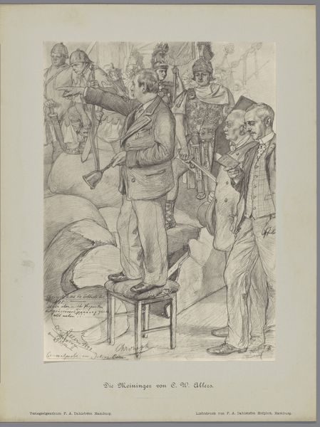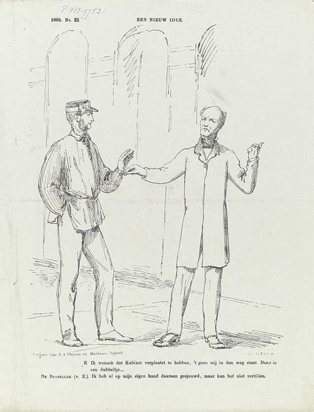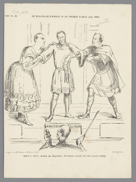 Johan Michaël Schmidt Crans created this lithograph titled ‘Spotprent met de abt voor de koning’ in 1868. The stark monochrome of the print throws its structural elements into sharp relief, creating a scene dominated by contrasts in form and gesture. The composition stages a clear hierarchy, positioning the king upright, while the abbot is frozen mid-supplication, brandishing a tiara. This contrast underscores tensions between secular and religious authority. Crans uses line and form to question established values by subverting the traditional iconography of power. The stiffness of the King’s posture is heightened by the intricate detailing of his military attire. The rigid lines of his uniform oppose the flowing robes of the abbot. The print thus becomes a stage for exploring themes of authority, faith, and national identity. The careful arrangement of figures and symbols invites us to decode the underlying structures of power at play in this historical moment.
