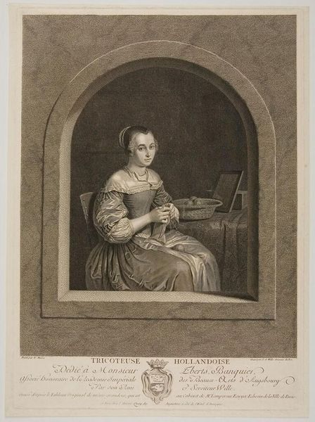 Editor: So, here we have Johann Georg Wille's "Dutch Newspaper Vendor." The details in this print are incredible. It seems like such an ordinary scene, but rendered with so much care. What stands out to you about this image? Curator: It’s interesting to consider the social role of such imagery. This print elevates a common vendor, giving her a certain dignity through its refined style. How does this depiction contribute to or challenge societal perceptions of labor and class? Editor: I see what you mean. By portraying her with such attention to detail, Wille almost seems to ennoble her profession. Curator: Exactly. And the choice to depict her in profile, almost like a classical portrait, further elevates her status. It prompts us to think about who is typically represented in art and why. Editor: That’s a perspective I hadn’t considered before. It makes me wonder about the intended audience and how they would have interpreted this image back then. Curator: Precisely! Examining the historical context reveals how art actively shapes and reflects social values. Editor: Thank you - that's really interesting!