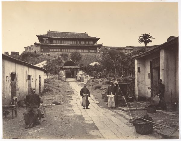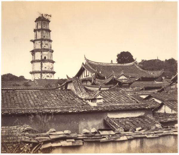 John Thomson created this silver print photograph, "Great Pagoda at Foochow, the Largest in China," around 1870. The scene is dominated by the pagoda itself, a multi-tiered tower that rises with an organic rhythm. Its structure appears to defy gravity, yet the formal composition emphasizes the play of light and shadow across its form. Thomson uses linear perspective to draw the eye upwards, accentuating the building's verticality. The surrounding structures serve as a base, rooting the pagoda in its environment while simultaneously contrasting with its soaring presence. The monochromatic tones, combined with the composition, evoke a sense of timelessness, capturing not just a structure but a cultural and philosophical idea. The photograph prompts questions about the relationship between the earthly and the spiritual, the permanent and the transient. It invites us to contemplate how the forms and structures we build reflect our deepest values and beliefs.