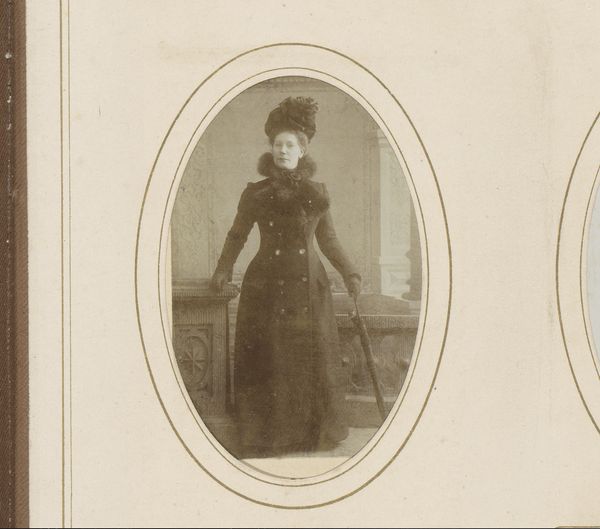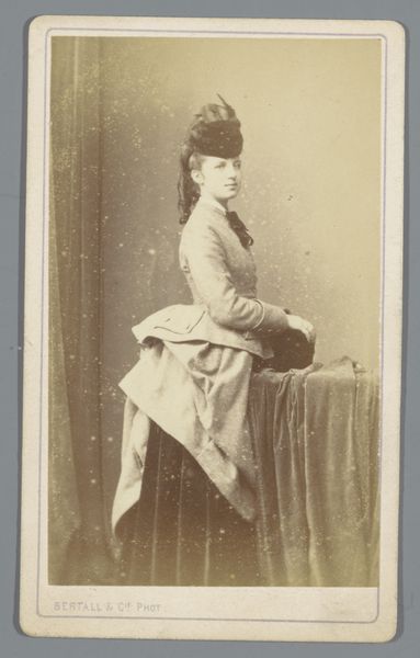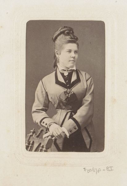 Curator: Editor: So, this gelatin silver print, "Portret van een staande vrouw," dating from 1867 to 1904 by Johannes Ephraim, is really evocative. It's striking how much the material, the aged paper, contributes to its overall vintage feel. How would you interpret this piece, especially considering its medium? Curator: Let's focus on that medium - gelatin silver print. Mass production was emerging. Photography was not just about capturing an image but also about entering into industrial means, which democratized portraiture to a degree. Notice the woman's attire. Consider the labor involved in creating those garments, the social status they denote, and how this portrait, a manufactured object itself, played into those displays of class and taste. Does it complicate your initial feelings? Editor: Definitely. It makes me think about access. Was she from a family that benefited from the era's economic changes to afford the garments, a portrait, even though mass production made these relatively affordable, more common? Curator: Precisely. And consider the role of the photographer. This isn't just art; it's labor, a commodity. The very process involved materials, chemicals, a studio... all resources within a specific economy. How does recognizing these material conditions shift your understanding? Editor: It feels like it grounds the image. It's not just a pretty picture; it's evidence of social and economic factors. Now, what intrigues me the most is thinking about all of those details behind the creation, which were probably not obvious at first glance. Curator: And by focusing on those material realities, we've gained a richer understanding of the woman, the artist, and the broader societal context. It always comes back to how the thing was made, consumed, and circulated.