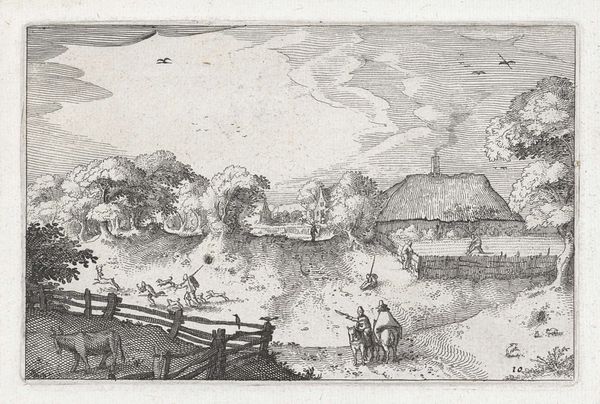This small landscape was etched by an anonymous artist, depicting a scene of travelers resting by a roadside inn. The most striking motif is the open road itself, snaking through a landscape of distant mountains. Historically, the road is a potent symbol of journey, pilgrimage, and the passage of time. Think of the Roman roads, arteries of empire, or the Silk Road, a conduit for cultural exchange. The figures pause at an inn, a place of rest but also a crossroads, a space where stories and destinies intersect. Consider how the road appears in the myth of Oedipus, leading him unwittingly to his tragic fate, or in the tale of the prodigal son, whose journey home signifies repentance and redemption. The image of the road taps into our collective unconscious, evoking the human desire for exploration, the search for meaning, and the eternal cycle of departure and return. Even in its humble execution, this small print resonates with a sense of timeless human experience.