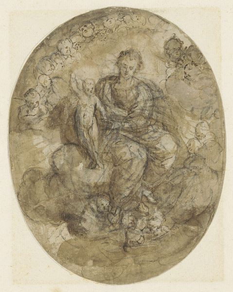 We might call this drawing a “noble wreck.” Drawn with lively assurance, it is also now sadly damaged. The scene is the Annunciation, a story from the New Testament book of Luke in which the angel Gabriel announces to the Virgin Mary that with the coming of the Holy Spirit she will conceive and give birth to the child of God, Jesus, who will rule the descendants of Jacob forever. This drawing was recently attributed to the Verona artist Paolo Farinati by Dott. Stefano L'Occaso, Director of the Palazzo Ducale (Mantua), who compares it to the artist's altarpiece of the same subject in SS Nazaro e Celso, Verona, which is signed and dated 1557. He has beautifully captured the drama of the miraculous event. Gabriel seems to glide down from heaven as his hair and clothing flutter in gusts of wind. He bends slightly to help alleviate Mary’s apparent fear, and he points upward to indicate the source of his astounding news.