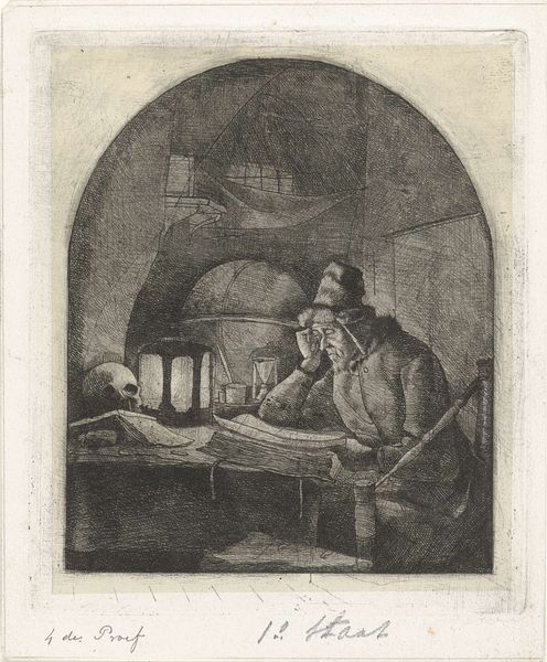 Curator: Jacobus Ludovicus Cornet created this print titled "Geleerde in zijn studie", sometime between 1825 and 1882. The etching, now held at the Rijksmuseum, really sets a mood. What's your initial take? Editor: Somber, definitely somber. The tight composition, the darkness contrasted against the stark light of the lamp, the skull… it’s a scene steeped in contemplation of mortality. Curator: Yes, the memento mori theme is strong here. Considering the romantic period, this print may reflect broader anxieties about progress. How do you think the engraving as a medium, ties into its themes? Editor: The etching process, with its precise lines and the way it builds up tone, gives it an almost academic, methodical feel that’s appropriate to the scholarly subject matter. It feels intentional, a slow, deliberate construction, emphasizing the labour behind artmaking as a reflection of laborious learning. Curator: Absolutely. Looking at the materiality, it's clear how printmaking democratized imagery, moving intellectual pursuits outside elite circles. This connects to Cornet's choices – note the detailed depiction of everyday life contrasted with classic memento mori symbols. How does that tension strike you? Editor: It's striking. Formally, the composition directs your gaze from the skull and candle to the scholar, then to the globe behind him; guiding the viewers eye through the composition, from death to enlightenment to scholarly knowledge, reflecting on themes of transient life against lasting legacy. Curator: Cornet likely wanted to make a statement about labor. I’d suggest this piece challenges ideas around ‘high art,’ and instead is really engaged in showing knowledge is something created through toil, rather than being divinely accessed. Editor: Well, I can’t argue that the piece provokes thought around that tension, no matter Cornet’s intentions! Thanks to its design, the ideas really leap off the print. Curator: Indeed. The artist provides a tangible sense of history in this scene; it reminds us how such images were reproduced, consumed, and valued within 19th-century Dutch society. Editor: Ultimately, it’s an evocative piece, one that effectively uses light, shadow, and composition to create a lasting impression of reflection on knowledge and mortality.