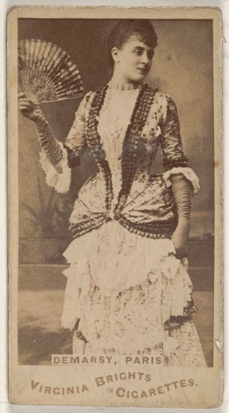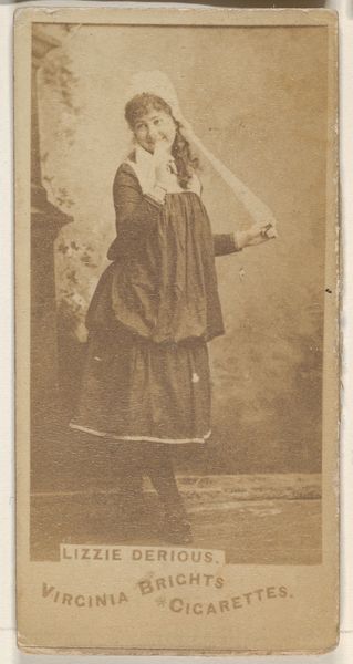 Editor: So this is "Lilly Howard, from the Actors and Actresses series," created sometime between 1885 and 1891 by Allen & Ginter. It's currently held here at the Met. The pose feels quite theatrical, very staged, with this muted palette. What visual elements stand out to you? Curator: The composition presents a deliberate arrangement of shapes and lines. Observe the dancer's contrapposto stance, creating a dynamic interplay of diagonals. The subtle gradations of tone on the toned paper articulate her form and costume. Notice how the artist manipulates light to emphasize certain features while obscuring others, creating visual interest through chiaroscuro effects. What compositional decisions strike you as most impactful? Editor: I think it’s the use of line, both in her posture, the drape of her clothing and the blurred background that give it movement and drama, especially since the palette is limited. The implied movement is so strong. But is there more here than just an exploration of form? Curator: The limitations imposed by the print medium actually foreground a specific intention: The emphasis shifts away from realism and concentrates the viewer’s attention on the surface quality. The very two-dimensionality of the image underscores the aesthetic intent. So rather than delving into historical context, or authorial intent, consider how these choices shape our visual experience and our appreciation of the aesthetic form itself. Do you see how its form generates the artistic merit and what we take away from this work? Editor: I see it now; by focusing on the line and form itself, I hadn’t noticed how that becomes the content. It reframes how I look at photography of this period. Curator: Indeed. Focusing on the visual and material construction can offer its own distinct rewards.