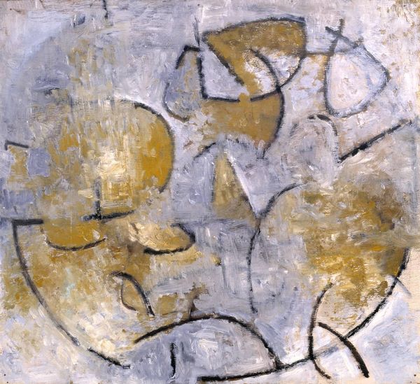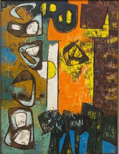 Editor: This is Martin Bradley's *Personnage Jaune*, held at the Tate. It's such a striking piece with these bold, almost childlike figures. How do you interpret the imagery and its context? Curator: Well, I see it as a product of post-war anxieties, channeling Surrealist automatism. Consider the rise of abstract expressionism and its exploration of the subconscious—Bradley likely sought to engage with that movement, using the canvas as a playground for exploring socio-political tensions through symbolic, rather than literal, forms. Editor: So, the "childlike" figures could be a deliberate commentary? Curator: Exactly. It questions the role of the artist within a rapidly changing world. Perhaps Bradley felt that the traditional forms of art-making were inadequate to address the new realities of the time. I find this work offers a powerful commentary on art's capacity for social and political discourse. Editor: I never thought of it that way, fascinating. Curator: Art history gives us these lenses.