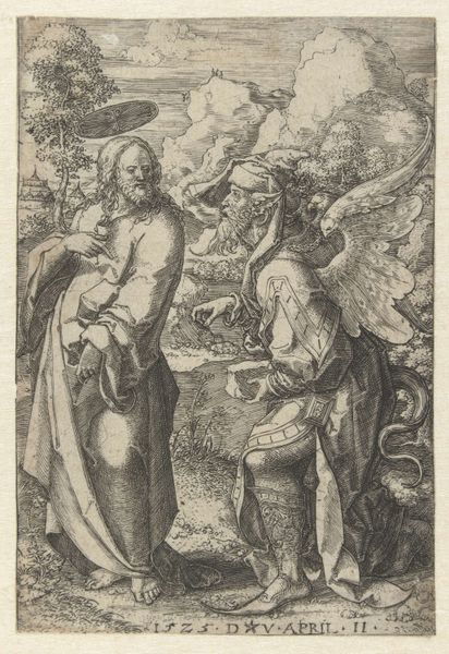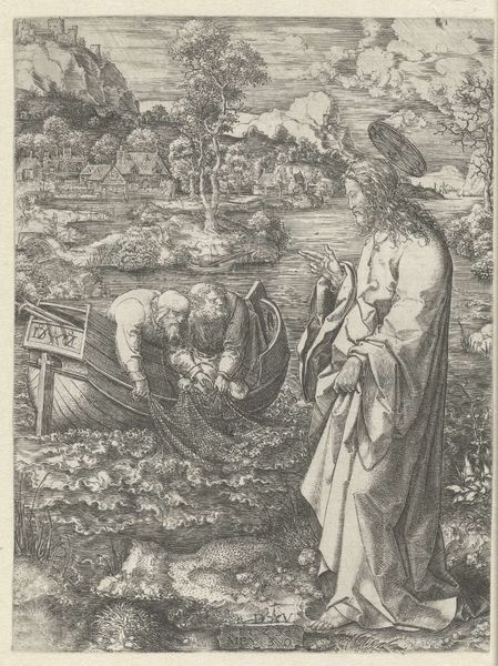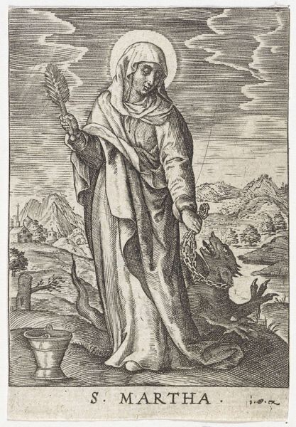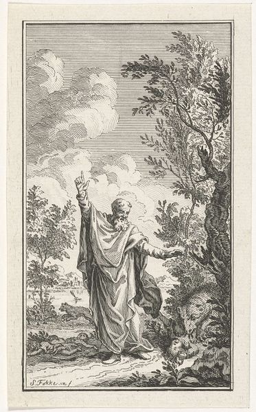 Editor: We are looking at "Jona," a print created around 1575 by Johann Sadeler I, currently held at the Rijksmuseum. It’s an intaglio, made with pen and engraving. The contrast between the detailed foreground and distant cityscape is quite striking, though I find myself drawn to the rather unsettling presence of what seems to be Jonah emerging from the whale’s mouth. How do you interpret this work from a formalist perspective? Curator: From a formalist vantage, we can observe that the engraving utilizes a very consistent hatching and cross-hatching technique, contributing significantly to the perception of depth and texture. Consider the positioning of Jona relative to the distant cityscape; notice how Sadeler used Jona's figure as a visual anchor, creating spatial dynamics. The formal elements of line, tone, and the calculated arrangement within the composition effectively convey the narrative. Do you perceive a deliberate structural organization in this print? Editor: I hadn't considered the spatial relationship in such detail, but I can now see how Jonah acts as this fulcrum that then projects into the deep space behind him. Do the lines around the border and the branches play a role too, containing the movement? Curator: Precisely. They are elements defining a frame. Each detail, from the figuration to landscape, is painstakingly crafted with precision, yet also a sense of deliberate distortion which serves to elevate the narrative. The interplay of the different elements guide our interpretation, drawing our focus to symbolic and narrative implications of the biblical theme. Editor: Thinking about line and space has really altered how I see it. I appreciate learning more about the relationship between the form and the narrative. Curator: Indeed. A close inspection unveils the sophistication through compositional ingenuity and refined linework. This type of analysis is core to the Formalist perspective.