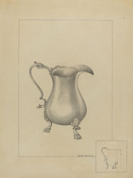 Charles Cullen made this drawing of a pewter pitcher, probably in the early to mid 20th century, with graphite on paper. I love the way he's used a soft, almost smudgy application of graphite to convey the sheen and texture of the metal. The drawing has this beautiful, luminous quality; Cullen really captures how light plays across the surface, especially on the body of the pitcher, where the graphite is layered to create a subtle gradient from light to dark, giving it real volume and weight. Look at the confident lines that define the handle, contrasting with the more tentative, sketchy marks used to describe the feet. There's a real sense of the artist exploring the object, figuring out its form and presence on the page. It reminds me of some of Morandi's still life paintings, with their quiet contemplation of everyday objects. There's a stillness here that invites you to slow down and really look. It's a reminder that even the most ordinary things can be extraordinary when seen through the eyes of an artist.