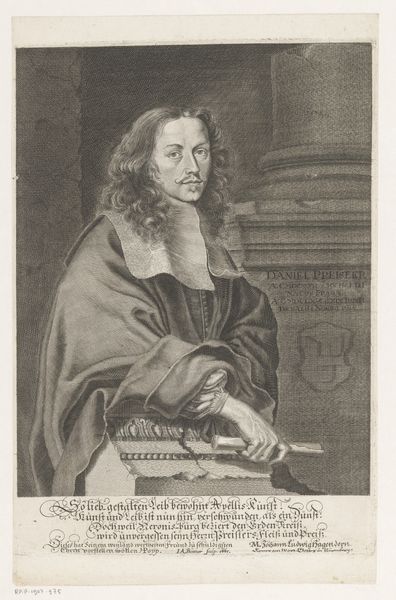Editor: Here we have a portrait, “Portret van Johann Christoph Nicolai,” made sometime between 1665 and 1721 by Christian Romstet. It's an engraving. It feels very formal, very much about status and intellect. What symbolic weight do you see in an image like this? Curator: It's fascinating how this seemingly straightforward portrait encodes so much about Nicolai's identity and societal expectations of the time. The book he holds is not just a prop. What does the very presence of a book signal in a portrait from this era? Editor: That he is educated? Important? Curator: Exactly. But even deeper, it represents access to knowledge, wisdom, and the sacred – consider the religious implications of the text that it might contain. How does this connect with his clerical collar? And, notice the text inscribed at the bottom. Editor: Yes, there's a lot of Latin. Curator: Indeed, it serves to further solidify his position as a learned theologian. Think of the use of Latin, even today, as a symbolic connection to history, authority, and exclusivity. The gaze, directed slightly off-center, suggests both confidence and perhaps a touch of introspective contemplation. What does it tell you? Editor: I see a man who is powerful, yes, but perhaps also burdened by the weight of his position. All the visual elements build on that impression. It's almost a type of uniform of intellect and religious duty. Curator: Precisely. Engravings like this helped construct and disseminate particular cultural memories and ideals. The image becomes a symbol itself. It perpetuated a very specific vision of authority. Editor: I didn't initially think about it in terms of its cultural impact beyond just being a portrait, but now I can definitely see how it tells a larger story about that era. Curator: It makes you wonder, doesn't it, how images continue to shape and solidify the symbols that still resonate with us today?