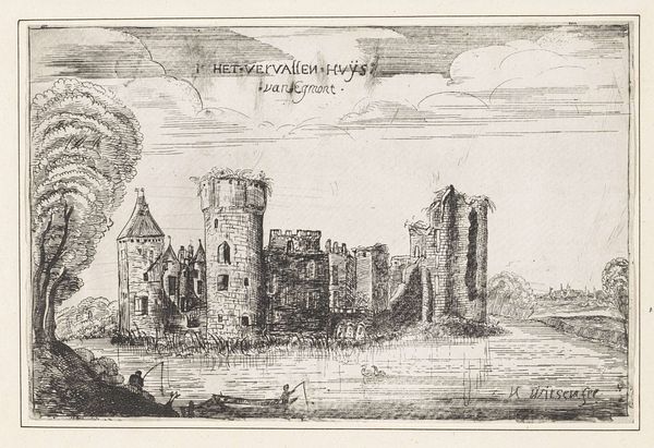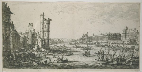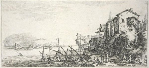 Editor: This etching, "Aangemeerde schepen in de haven, nabij een ronde toren" or "Moored ships in the harbor, near a round tower," is attributed to an anonymous artist and was created sometime between 1614 and 1664. I find the details in the depiction of the boats really striking, yet the architecture is…almost crumbling. What draws your eye? Curator: I concur regarding the contrast. Note the masterful deployment of line – see how its density modulates to construct form and spatial recession. The hatching technique around the tower and ships creates a rich, almost tactile surface. But observe further, the orthogonals established by the buildings. They are suggestive, rather than definitive. What does that evoke for you? Editor: I think it feels unbalanced, maybe? It makes me wonder about the artist’s choices in terms of perspective and what they were trying to emphasize by creating such different depths. Is there a tension between the precision and lack of definition that creates some sort of visual argument? Curator: Precisely. The spatial ambiguity disrupts a purely mimetic reading. Consider the interplay between the precise lines defining the ships and the looser rendering of the cityscape. It suggests a structured composition resisting total legibility. Do you discern a thematic implication stemming from the artist’s deployment of etching? Editor: Maybe? I guess that the contrast enhances that dilapidated feel, or hints at a deeper, almost melancholy atmosphere to what is probably an ordinary harbor scene. It's thought-provoking that an emphasis on the lines and forms creates a richer understanding of Dutch Golden Age seascapes than merely capturing the details of what they represent. Curator: An insightful observation, especially in the semiotic possibilities inherent within a cityscape such as this one, wherein signs proliferate even if they never signify an absolute “truth”. By considering the relationships and formal structure inherent in its design, this artwork is understood within the boundaries of language. It enables richer analysis and a rewarding engagement beyond the literal depiction.