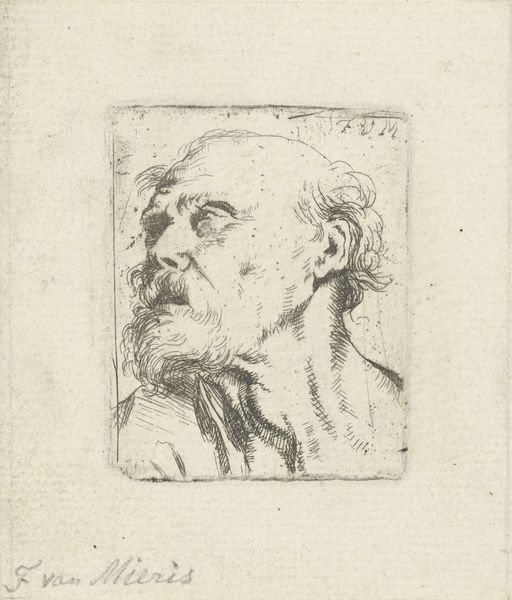 Curator: This is "Head of an Old Man, Looking Down, in Profile to the Right," a pencil drawing created between 1587 and 1668, attributed to Alessandro Tiarini. Editor: The delicate lines immediately strike me. There's a quietness, a sense of introspection captured in the slope of the head and the downturned gaze. It's melancholic, almost resigned. Curator: Well, considering its materiality as a pencil drawing, we can consider how accessible and reproducible such portraits became due to paper production during this era. It moves art from being an elite privilege to something that artisans can afford to experiment with. Editor: I see it also in terms of line and form. Look at the masterful rendering of the face through the most minimal strokes! The hatching gives a three-dimensionality that speaks volumes about Tiarini’s understanding of light and shadow. It’s Baroque restraint, but so effective. Curator: Baroque certainly, and that restraint underscores the shifting power dynamics within the Bolognese School. By concentrating on the tools readily available—pencils, paper—artists opened new avenues for workshops and apprentice systems to generate art for increasingly wider markets. It brings up questions about mass-produced art and copies of older, revered art, which allowed greater social diffusion, even if not always perfect copies. Editor: But isn't the focus, though, precisely on the artist's unique skill? It’s in those subtle gradations, that incredibly lifelike rendering. The piece draws you in, as though you were there in the room. How can one think only of tools when faced with that level of evocative depth? Curator: Precisely, we should consider then the material affordances here that would shape how that portrait became part of material culture beyond its immediate purpose. Was it a preliminary study for something grander? A teaching tool in a studio? Its current life depends on it surviving until this very day to tell its story and become more. Editor: Interesting considerations, indeed. It is like observing someone caught in thought, beyond time. The elegance of simplicity! Curator: Absolutely! Reflecting on the artwork's life underscores its place within historical processes and changing artistic practices, adding a critical lens for modern appreciation. Editor: Yes, together we see that both its place in art history and material relevance highlight Tiarini’s sensitive portrayal of humanity's quieter moments, and its visual simplicity becomes timeless.