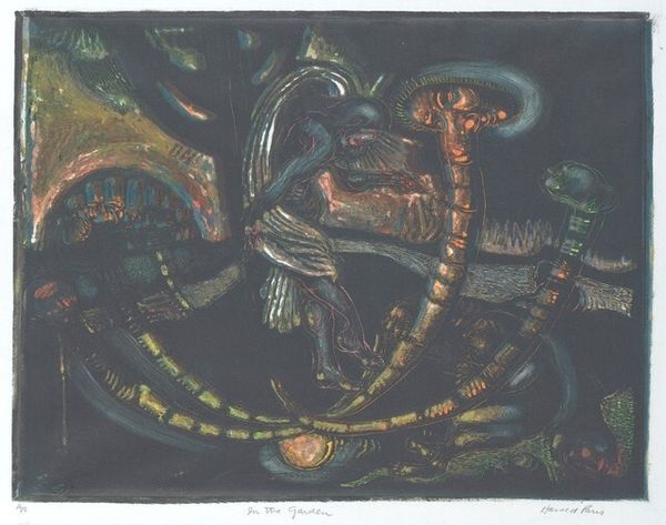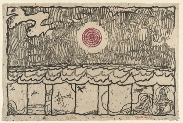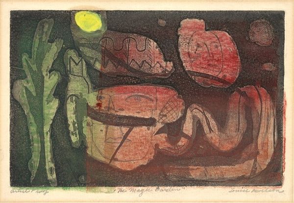 Louise Nevelson made this print, called ‘The Magic Garden,’ using etching, a process where the artist manipulates a metal plate with acid to create an image. Look closely, and you’ll notice the layered approach to mark making. The textures and colors in this print feel subterranean to me, like you’re diving beneath the surface of a dream. There are these floating, ambiguous forms rendered in mossy greens, earthy reds, and shadowy blacks. Notice how Nevelson carves out a kind of playful space. It’s like a theater of the mind where shapes emerge from a dark, inky ground, kind of like the paintings of Forrest Bess. Nevelson’s printmaking reminds me that art is always a conversation, an ongoing dialogue across time and between artists. It's not about fixed meanings but about embracing the magic of ambiguity.