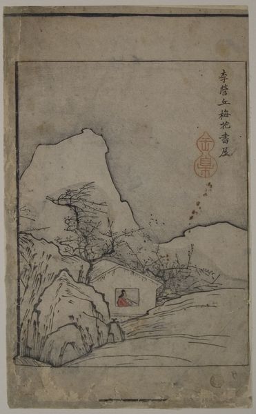 Curator: This evocative print is by Totoya Hokkei, created in 1821. The Rijksmuseum calls it "The Shrine of Benten on Chikubushima Island." As an ukiyo-e woodblock print, it offers a window into a complex layering of social and spiritual contexts. Editor: It has such a delicate and contemplative feel, doesn’t it? A quiet energy emanates from that isolated shrine nestled amidst the rocky terrain. Curator: Absolutely. Benten, the goddess enshrined here, holds a significant position in Japanese culture. She's a syncretic figure, absorbing elements from both Shinto and Buddhist traditions. Often associated with music, eloquence, wealth, and even warfare, her multifaceted nature reflects the diverse roles women occupied in Japanese society, wielding influence in ways that were often indirect or veiled. Editor: The composition also speaks to this idea of hidden power. We see the torii gate, the red shrine building—markers of sacred space—but they're almost swallowed by the natural landscape. It speaks to a subtle but persistent cultural memory, like an enduring seed of meaning in the collective consciousness. I think even the inscription, framing the island and structure, ties the goddess' symbolic attributes directly into the ukiyo-e landscape itself. Curator: Indeed. Ukiyo-e prints were circulated among the common people, not the elite. In its own way, this image of a shrine is accessible, placing the feminine divine within the everyday world. Perhaps Benten's varied portfolio of attributes—from wisdom to protection—was meant to appeal to all viewers regardless of social status. We also might see the island and torii in this compressed composition as something subtly aspirational, or as the quiet affirmation of feminine influence. Editor: Thinking about this layering, it seems the image invites us to consider how visual symbols like this, imbued with rich histories, constantly adapt and accrue meaning in the course of time. Benten represents a remarkable constellation of cultural values. Curator: Hokkei gives us a rich depiction to consider the enduring relationship between spirituality, landscape, and cultural identity. Editor: It leaves one to ponder not just the artistic skill involved, but the weight of symbols in shaping human experiences.