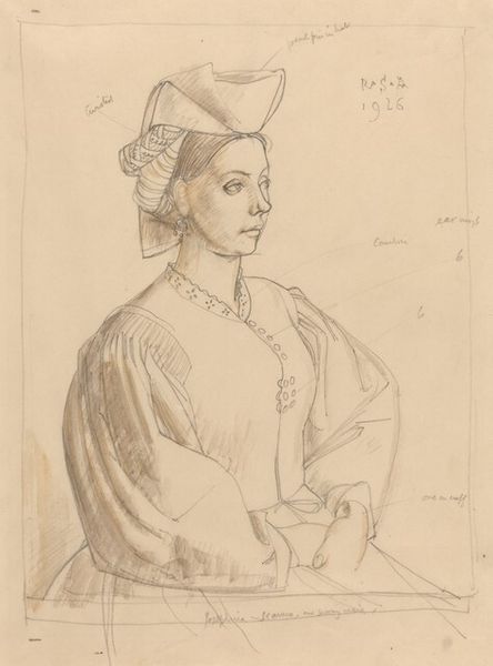 Curator: Here we have Magnus Enckell’s "Rouva Anni Lagerborg, luonnos," a pencil drawing from 1912. The sitter, Anni Lagerborg, gazes demurely to the right, wearing a rather elaborate hat. Editor: My first impression is one of quiet introspection. It’s a study in soft lines and gentle shading; the figure seems almost to emerge from the page rather than being sharply defined. It’s so intimate, I feel like I'm looking at something very private. Curator: That intimacy is a hallmark of Enckell’s portraiture. The use of pencil, particularly in a preliminary sketch like this, really emphasizes the immediate and personal connection between artist and sitter. Do you find her gaze passive, or is there more at play? Editor: Well, it depends how we interpret the symbol of the hat. In the early 20th century, a woman's hat was an emphatic statement about her social standing. I imagine Lagerborg's hat acted like an empowering piece of armor, providing social visibility and permission. Curator: Interesting! Perhaps that's a defense that protects against outside judgments? If we acknowledge the role Lagerborg occupied in society and recognize that her choice to embrace fashion norms gave her influence, would you view the work differently? Editor: Yes, understanding that Anni Lagerborg belonged to the intellectual and artistic circles of the time absolutely deepens my understanding. But beyond the immediate social and aesthetic signifiers, Lagerborg and Enckell had a shared connection, which inevitably appears in this work. Enckell produced a series of drawings and paintings during this period that capture shared cultural anxieties in a rapidly modernizing world. The gaze carries the weight of cultural upheaval and yet offers this very grounded assertion of being, being alive. Curator: It’s fascinating to see how Enckell captures this moment of societal shift within the intimacy of a portrait. Looking closely, one can really appreciate Enckell’s technique, his mastery of capturing light and shadow with just a few carefully placed lines. This sketch captures a historical persona within a fleeting impression, freezing cultural norms. Editor: Indeed. What begins as a portrait of a woman transforms into a historical, sociological portrait. I initially saw only softness and gentleness, but with context, I am now struck by its potent narrative of social pressures and silent strengths.