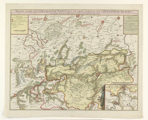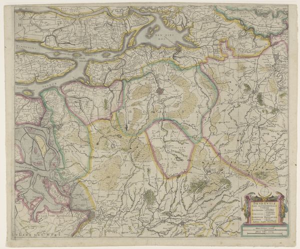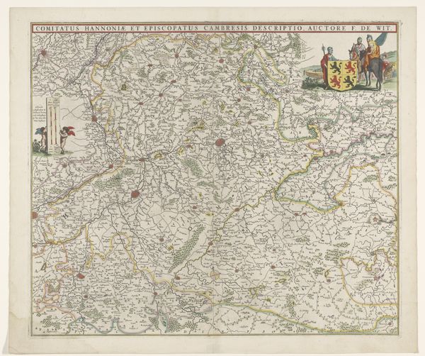 Editor: This is "Kaart van Overijssel," a map of the Overijssel province made sometime between 1640 and 1652 by an anonymous artist. It's an etching, which gives it this amazing detailed, almost scientific quality. What aspects of its materiality or creation processes strike you? Curator: The etching medium is paramount, isn't it? It speaks volumes about the economic and intellectual investment in mapping at that time. To create these maps wasn't simply an aesthetic exercise; the reproduction and distribution of geographic data had implications for trade, military strategy, and ultimately, social power. Editor: So the choice of etching, a repeatable medium, is crucial to understanding its impact? Curator: Precisely. It moves away from unique artistic creation and toward mass-produced information. And notice the decorative elements – the figure in the corner, the elaborate cartouche. These blend artistry with what we think of as a straightforward geographical document. It begs the question: what were the working conditions of those who were actually creating these lines, defining boundaries, etching them into existence? It was skilled labor, a form of cultural production in and of itself. The artist would have had a deep understanding of copper-plate engraving to make the details legible, in line with contemporary aesthetic practices. Editor: It’s interesting to consider it as a manufactured object that’s disseminating data. Curator: Absolutely. It forces us to reconsider what "art" even meant at that moment. What kind of workshops produced these prints? How did the economics of printmaking shape the final image? Editor: Thinking about the materials and the making process opens up a new way to understand what this map signified beyond just geography. Thanks. Curator: Indeed. Shifting focus from authorship and aesthetics to production helps uncover the cultural work this "Kaart van Overijssel" performed.
