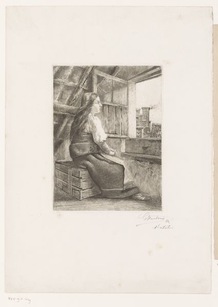 Curator: What strikes me immediately is the subdued palette; it speaks of diligence but also, perhaps, the quiet solitude that often accompanies scientific work. Editor: Indeed. We're looking at "Woman in Laboratory," a pencil and charcoal drawing on paper by Herman Heijenbrock, created sometime between 1900 and 1925. Heijenbrock often depicted industry and labor, but this piece feels unusually intimate. Curator: The laboratory setting is rich in visual cues. All those bottles and jars suggest a realm of alchemical experimentation, but her focused gaze speaks of careful empiricism. Do you think Heijenbrock meant to portray a certain archetype? Editor: Absolutely. During this period, women in science were often fighting for recognition in male-dominated fields. Her poised stance and serious demeanor push back against expected gender roles; there’s a statement of purpose in the composition itself. Curator: I find the contrast between the sharp lines of her coat and glasses and the softer shading of her face rather telling. It is like seeing the duality of human versus rationality. Editor: It highlights a really crucial intersection of that era, as gender defined one’s identity while also informing biases in science, politics, art, and just about everything else. Do we celebrate her unique ability to synthesize this? Curator: I appreciate the detail given to her surroundings – the tools, the shelves. They are ordinary, commonplace – but charged with the potential for discovery, for transformation. A clock hangs in the background as well, speaking to the passage of time required for these insights to be realized. Editor: It is almost defiant – presenting a common worker as an intellectual protagonist in her environment, making a quiet feminist claim that still holds resonance today. Curator: Yes. I keep seeing her as both an individual and a symbol of a broader historical shift in gender dynamics in the early twentieth century. It is striking to remember how groundbreaking an image like this could be at the time. Editor: The drawing reminds me that art can participate in the project of re-evaluating these historical forces by opening them up to renewed conversation. It's important to bring the conversation into the present as we look back at her place in science and art.