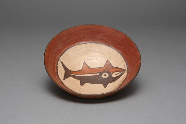 Curator: Welcome. Here we have a ceramic plate dating from about 180 to 500 CE, created by the Nazca people. It’s entitled "Plate Depicting a Pair of Fish or Sharks in Interior" and it's held in the collection of The Art Institute of Chicago. Editor: Immediately striking is the simplicity. Two stylized creatures float in a cream-colored space, starkly set against the warm reddish-brown of the plate itself. It’s minimalist, almost proto-modern. Curator: It is remarkably direct. The Nazca culture, flourishing in ancient Peru, had a deep connection to the sea, even though they lived in a desert environment. Marine life was a vital food source but also imbued with spiritual significance. Editor: Notice how the artist employs basic geometric forms. The bodies are simple tubes, and the fins are triangles, while the circular eyes hold complex patterns. There’s a clear intention to reduce these creatures to their most essential visual components. Curator: The choice of depicting sharks—if that is indeed what they are—speaks volumes about power and respect. Sharks were likely revered for their hunting prowess and their role in the ocean ecosystem. Perhaps they symbolize the connection between the Nazca people and the larger world. Editor: The contrast in hues – the light cream with the darker outlines, the red of the clay with that lighter inner field–creates a tension, visually reinforcing a duality or a formal dialectic between figure and ground. Curator: And of course, understanding these designs is difficult without considering their function. Were these plates used in everyday life, or reserved for special rituals and ceremonies? These are critical questions that we need to ask. Editor: Ultimately, regardless of original context, the clean, almost abstracted forms still resonate with a contemporary viewer. Curator: Absolutely. The lasting power lies in the blend of its historical narrative and powerful visual economy. Editor: I agree. It is an interesting case of form following survival.