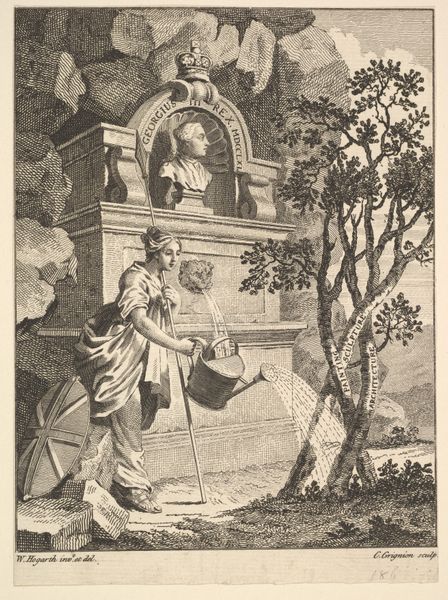 Curator: We’re looking at "Christus en de Samaritaanse vrouw," or "Christ and the Samaritan Woman," an engraving on paper by Andries van Buysen the Elder, dating from around the 1710s. Editor: The first thing that strikes me is how intimate this scene feels, despite being set in a rather formal, almost stage-like landscape. It's so delicate, rendered with a sort of loving precision that just melts my heart a bit. Curator: I find the narrative so crucial here. This is a pivotal moment in the Gospel of John, isn't it? Christ engaging with someone outside the acceptable social boundaries, a woman, a Samaritan, in public... Buysen captures the tension in their interaction beautifully. Consider the implications of challenging societal norms on gender and religious status in the 18th century, the period during which the piece was made. Editor: True! I see how the period context infuses this work with even deeper meaning; although this particular version is an interpretation of a timeless story, it’s cool to see how the Baroque trappings play out in these almost cartoonish facial expressions and exaggerated drapery! Curator: Indeed. And I am always drawn to how landscapes were utilized at the time. We should look at the broader tradition of religious narratives intersecting with idealized landscapes of the period and consider the philosophical and political underpinnings of situating these narratives in an idyllic scenery that reflects certain religious sentiments. Editor: The landscape… that feels almost too idyllic to me, considering the undercurrents. You know what I mean? Like a velvet painting trying to depict some street grit. But it’s undeniably beautiful too. There is this little visual game in the landscape in the background with other people approaching in groups that’s like some social commentary meets visual gimmick; really clever! Curator: It is a fascinating paradox, and an insightful connection between faith and representation, highlighting how cultural biases were, and are, manifested and contested within the art historical landscape. Editor: Makes me wonder how different viewers respond, and if, after all this time, it still provokes even the mildest feeling of self-reflection in those who encounter it. Curator: I would agree. Reflecting on this through diverse perspectives enriches our understanding. Editor: Well, that’s given me a lot to ponder!