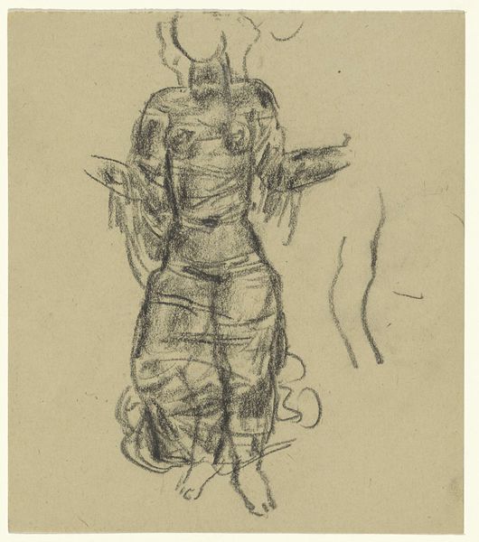 Charles Rochussen made this pencil drawing of a standing man with a lute. Rochussen was working in the Netherlands during a period of significant social change and artistic development; he was known for his illustrations of everyday life, often with a humorous or satirical edge. The man in this drawing is seen from behind, wearing what appears to be a theatrical costume, complete with a feathered hat, the lute hanging from his left hand. The figure's casual pose, with one hand on his hip, suggests a moment of rest or contemplation. Consider how the figure represents a moment of performance, of assumed identity. Rochussen’s work captures a sense of the performative nature of identity, which reflects the growing diversity and self-awareness within Dutch society. This drawing might seem like a simple sketch, but it invites us to think about how we construct our identities, and how artists like Rochussen observed and portrayed these shifts in their rapidly changing world.