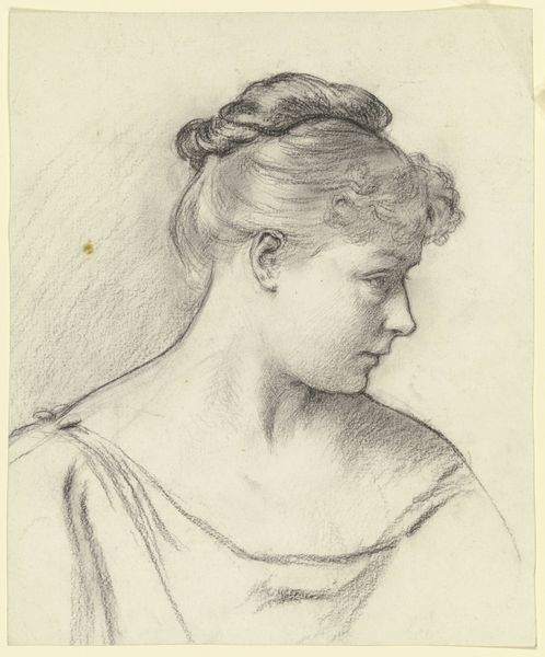Curator: This delicate drawing is "Head of a Woman with her Hair Up, in Profile" by Washington Allston. Though undated, it resides here at the Harvard Art Museums. Editor: It's quite understated, isn’t it? The simplicity of the line and the soft color of the paper create a sense of quiet introspection. Curator: Allston was working within a Neoclassical tradition that valued idealized beauty, but he was also exploring Romantic themes of emotion and inner experience. The profile view, of course, lends itself to statuary, to a sense of the monumental, even in this small format. Editor: The material itself, the paper and the charcoal, speak to a provisionality, though. It feels like a fleeting impression, a sketch capturing a moment, not necessarily striving for permanence. Was this preparatory for another work, perhaps? Curator: It very well could have been. Allston often made studies of figures and faces for his larger history paintings. This drawing captures a certain sensibility, a yearning for something beyond the immediate. Editor: It's interesting how the materiality softens that academic edge. The sketchiness lends it a vulnerability that a more finished work might lack. Curator: Indeed. It offers a glimpse into Allston's process and, perhaps, into the very human experience he sought to represent. Editor: A beautiful reminder that even in studies, value and emotion persist.
