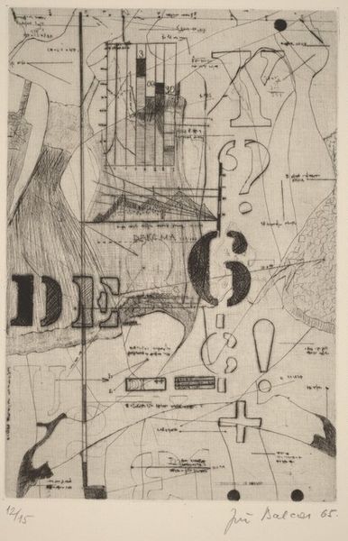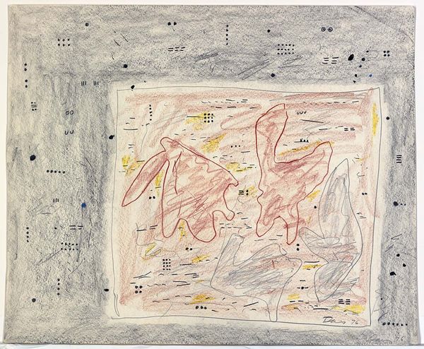 Editor: This is *Dereau No. 11* created by John Cage in 1982, a drawing composed of ink and colored pencil on paper. I'm struck by the quietness of it. The colors are muted, almost faded, and the composition feels so open, almost incomplete. What do you see in this piece? Curator: I see a fascinating intersection of chance and intention. Cage was deeply invested in exploring the subconscious. Look at how these seemingly random lines create patterns, echoing forgotten maps, astronomical charts, perhaps even ancestral markings. Do you see the repetition in some of the shapes, how they recall specific cultural symbols, almost like a visual mantra? Editor: I notice the geometric shapes. Are you saying these are references to something specific? I was interpreting them more as pure forms, abstract shapes in relation to each other. Curator: Consider the circle and the square. Throughout history, the circle represents the eternal, the cosmos, the divine. The square signifies the earthly, the material world, structure. Cage's juxtaposition invites contemplation of the relationship between these realms. Doesn’t it remind you of the Renaissance ideal of squaring the circle, uniting heaven and earth? Editor: Oh, I see. So, it’s less about pure abstraction and more about a dialogue between recognizable symbols and what they signify culturally. I didn't consider it that way. Curator: Precisely. And his use of pale inks and pencils evokes a sense of ephemerality, suggesting the transient nature of meaning itself. Cage, in a way, archives universal human memory in each seemingly random mark. Editor: I learned how important cultural symbols are to even abstract-looking pieces, and how one can analyze those to give artworks an underlying narrative that is so often invisible. Curator: Absolutely. Understanding the symbolic language in art helps us connect with past cultures and unlock hidden layers of meaning.