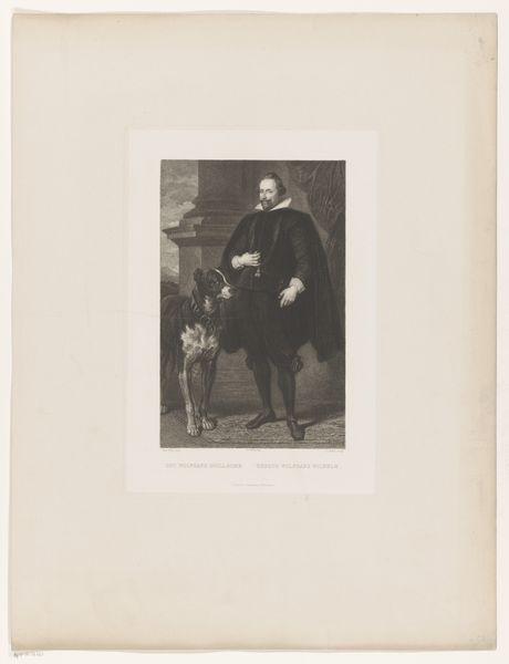 Curator: Looking at "Portret van Gideon de Wildt" created in 1866, at the Rijksmuseum. Editor: It has a rather formal air, almost theatrical. The man certainly appears self-assured. I am really curious, what's the history surrounding this piece? Curator: Frederik Hendrik Weissenbruch, the artist, likely wasn't depicting a contemporary figure. Gideon de Wildt was a prominent figure in the Dutch East India Company in the 17th century, and it is speculated that this portrait is derived "d’apres le tableau peint par Wornar Van Den Valckert 1637". We see reproduced at the botton an annotation about this. It gives the work a certain nostalgic quality. The process of its creation is also rather important. Editor: Could you elaborate on this? The medium, from a material perspective, strikes me as potentially mass-produced, thus undermining notions of artistic originality? Curator: Precisely! This isn't a unique painting. It’s a reproduction. Weissenbruch’s etching and the subsequent printmaking processes are essential to understand here. This artwork speaks volumes about the democratization of imagery. The very availability and consumption of it become part of the story. The print facilitates access for the rising middle class to acquire and display representations of wealth and prestige formerly reserved for elites. Editor: So the artwork becomes less about the depicted subject as such, and more about this new visual economy and circulation of ideas. Thinking about this distribution and reception… was there an intended political or social aim here? Curator: It taps into that 19th-century vogue for national history, particularly interest into the Dutch Golden Age, fueling narratives of national identity and past glories. We should ask to what ends are such figures from history presented for the contemporary viewers? Is it pure glorification, or more subtly weaving political agendas of its own? Editor: So it reflects a contemporary aspiration by the upper middle classes to assert social status through visual means but anchored within the Golden Age? I see the etching and its reproducibility challenge traditional art hierarchies through new labor and material arrangements of artwork. Fascinating. Curator: Exactly. It urges us to ask questions of art production in relationship to markets and shifting class dynamics, especially considering the socio-political factors surrounding it! Editor: Food for thought, indeed. The art market always leaves one feeling a little thoughtful.