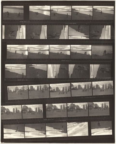 Editor: We’re looking at Robert Frank’s "Family--Wellfleet 17," a gelatin-silver print from 1962. It's a contact sheet, with numerous frames. Many depict a figure holding an American flag, others what seems like simple architecture. There's something both raw and nostalgic about it. How do you interpret this work? Curator: Frank’s contact sheets are incredibly telling. They offer a behind-the-scenes look at his process. In this image, consider the context of 1962: Cold War anxieties, the burgeoning Civil Rights movement, and a nation grappling with its identity. Editor: The flag is prominent. How does it fit into the broader narrative? Curator: The American flag is a recurring symbol in Frank’s work. However, instead of glorifying it, he often presents it in ways that reveal underlying tensions and contradictions. Its presence suggests themes of patriotism, but consider how Frank challenges traditional notions of national identity by positioning it against ordinary lives, and even the banality of a structure under construction. Are these ideals of patriotism being built, or torn down? Editor: That makes sense. The flag seems less celebratory and more like a question. I initially missed those implications. Curator: Exactly! Frank encourages us to question the idealized image of America and to look beyond the surface. We’re invited to examine how national symbols are experienced and embodied in everyday life. The gelatin silver print heightens the stark contrast and documentary feeling, while also hinting at intimacy and lived experience. Editor: So it's about looking at America critically through these combined images. Thank you. Curator: Yes. The arrangement allows the photograph to become a story of questions, doubts, and anxieties felt during an era of immense political change. I am glad you see it, too!