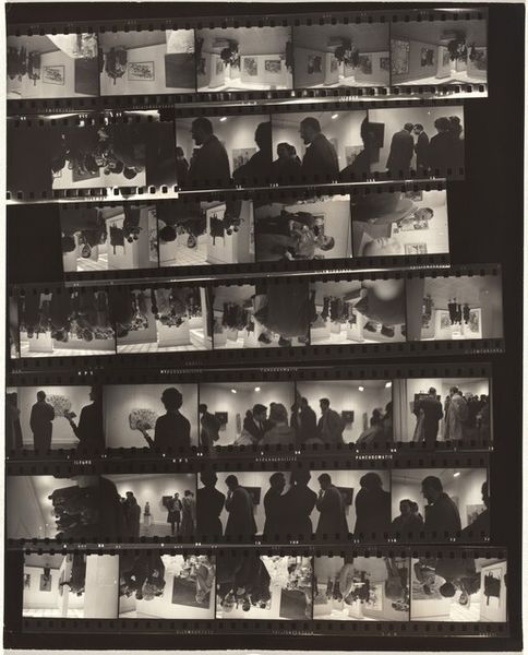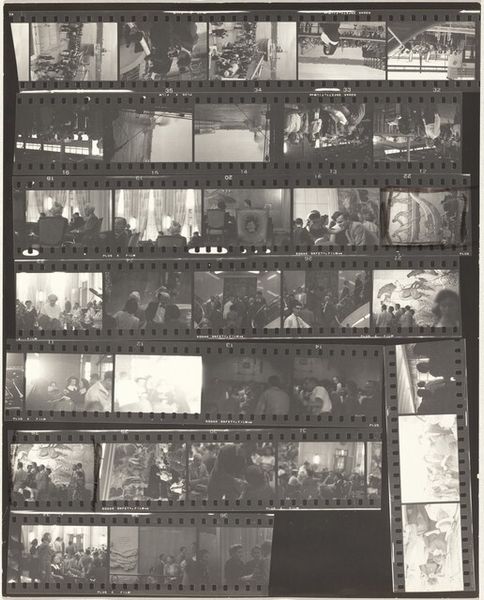 Curator: This fascinating piece is a contact sheet by Robert Frank, titled "Pablo Casals--Prades, France no number," taken in 1949. The work is a gelatin silver print. What strikes you about this contact sheet, as a material object? Editor: The immediate impression is one of raw documentation. It feels almost like forensic evidence, presented as is. The physicality of the film strip is apparent. Curator: Precisely. Contact sheets are inherently process-oriented. In this work, we're given insight into the labor of photography itself. This forces us to confront the nature of the image and the cultural legacy of Pablo Casals in Post War France. How does this photographic medium highlight the act of observing? Editor: The series of frames prompts considerations about how a narrative emerges through sequential images. There is an apparent struggle for the decisive moment; it's a dance between Frank and his subject. This makes one question whether that narrative ever delivers "the full picture", as Casals himself was, like many exiled creatives, a highly constructed, scrutinized image of displaced European male genius. Curator: Very true. The use of a contact sheet rather than a finished photograph invites us into the creative process, highlighting Frank's methods. It encourages a discussion of craft itself, and Casals' cultural importance through visual records. This becomes clear when one examines the repetitive composition of Casals playing cello, his head deeply slanted over the instrument, as if seeking solace, the black and white tones lend the scene a stark intimacy. Editor: The decision to leave the sheet intact also gestures towards photography as a mode of social observation. Look how we catch glimpses of interior spaces of Post-War Prades. Not just its most famous exile, but elements within reach of Frank's camera. I suppose this directs viewers to acknowledge the materiality of images – it's all the more thought-provoking when considering that a medium of production informs our understanding. Curator: I agree entirely. Ultimately, by embracing this kind of documentarian process, Frank acknowledges art's dependence on cultural moments and material conditions, shifting it towards an engagement with social practices beyond Casals’ talent. Editor: Yes, it invites us to see the intersection between personal artistic vision and a larger matrix of production, context, and time. That feels like a particularly compelling lens through which to appreciate the artwork.