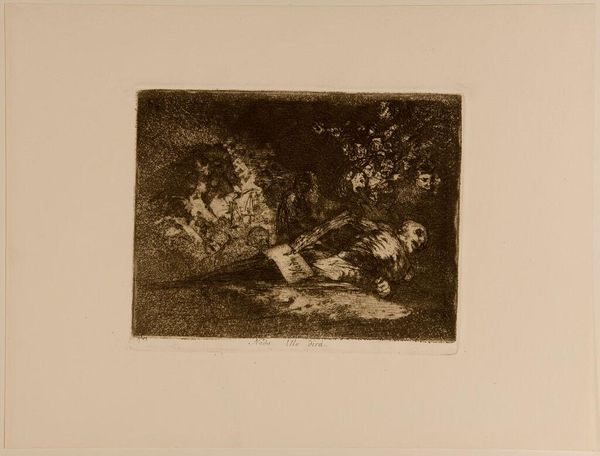 Curator: Goya's print, "Will She Rise Again?", presents a scene of profound tension. The stark etching technique really emphasizes the material reality of struggle, don't you think? Editor: Absolutely. I'm immediately struck by the vulnerable figure on the ground, juxtaposed with the looming, shadowy figure. It speaks to the power dynamics inherent in systems of oppression. Curator: The aquatint adds to the tonal range, creating deep shadows and highlighting the texture of the paper itself, which contributes to the somber mood. Editor: Indeed. And if we consider Goya's broader social commentary, it’s hard not to read this image as a critique of institutional power and its impact on marginalized bodies. Curator: Considering the etching process, each line is a deliberate act of labor, a physical manifestation of Goya's intent. Editor: Reflecting on this work, I'm reminded of the ongoing fight for justice and the importance of art as a tool for resistance. Curator: For me, it is Goya’s deliberate manipulation of materials that amplifies the emotional weight.