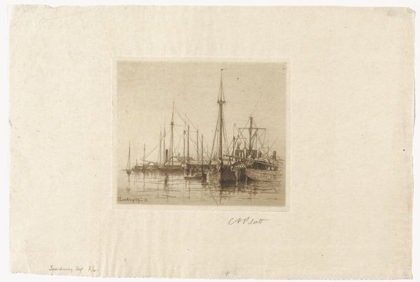 Stephen Parrish made "The Inner Harbor, Gloucester" using etching, a printmaking technique with a rich, linear quality. The image begins as a drawing on a metal plate, which is then bathed in acid. This process bites into the metal, leaving behind grooves that hold ink. The plate is then carefully wiped clean, leaving ink only in the etched lines. When pressed onto paper, it creates the final image we see here. Look closely, and you can see how Parrish used different densities of lines to create shading and depth. The subtle variations in tone, achieved through careful inking and printing, give the scene its atmospheric quality. The print captures the essence of a busy harbor, a hub of maritime labor and trade. The process of etching, with its reliance on skilled handwork, mirrors the labor-intensive nature of shipbuilding and seafaring depicted in the scene. It reminds us that art, like any other form of production, is rooted in human effort.