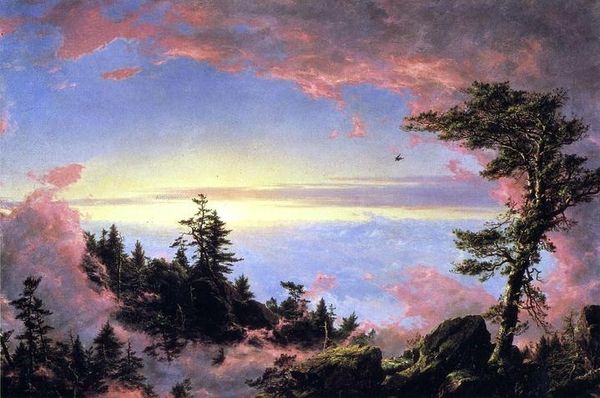 Editor: So, this is “View of the Hudson River from Olana” by Frederic Edwin Church. The medium isn’t listed, but it looks like oils. It feels both vast and intimate, mostly because of the fiery colors—that golden-orange haze washing over everything. How do you interpret this piece purely from its formal qualities? Curator: Immediately, one is struck by the tripartite division of space: foreground, middle ground, and sky. Observe how Church masterfully orchestrates color to delineate depth. The darker, earth-toned foreground leads the eye toward the shimmering, almost ethereal expanse of the Hudson River valley, culminating in a dramatic sky, saturated with pigment. Do you notice the texture in the paint application itself? Editor: Yes! In the sky, it's almost… translucent? But thicker and more opaque in the foreground, giving a sense of weight to the landscape. Curator: Precisely. That layering technique is vital to appreciating how Church builds up form and imbues the work with a certain… atmospheric dynamism. Consider also the relationship between the horizontal expanse of the landscape and the vertical thrust of the trees on the right. What effect do these contrasting orientations have? Editor: It’s like the trees are anchoring the landscape, preventing the eye from simply drifting off into the hazy distance. They also create a rhythm with the darker forms on the left. Curator: Precisely! Notice, too, the subtle tonal gradations within the orange and gold hues. They generate depth without resorting to sharp, linear perspective. The painting really does use very strong contrasts within a relatively narrow color palette to describe space. Editor: I see it now. By paying closer attention to its structural elements, the use of the colors, and the material of the medium, one can experience a great deal, even with only those basic observations. Thank you! Curator: Indeed. The artist truly manipulated color, form and texture to lead us through space. A masterful synthesis of observation and artistic innovation, wouldn’t you agree?
