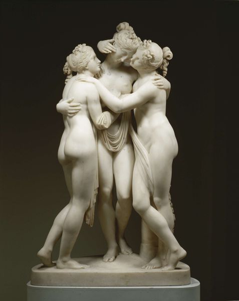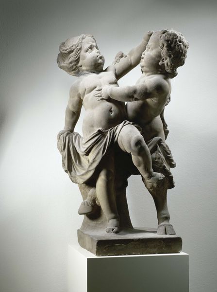 This stone sculpture, titled "A Girl Kissing a Satyr Boy, Allegory of Love" by Jan Pieter van Baurscheit the First, is a study in contrasts and textures. At first glance, the eye is drawn to the intimate gesture: a girl tenderly kissing a satyr boy. The composition relies heavily on the interplay between the smooth, rounded forms of the children's bodies and the rougher, more textured surfaces of the satyr's goat legs and the rocky base. The whiteness of the stone enhances the tactile quality, inviting a close inspection of the surfaces. This tension between the polished and the raw, the human and the bestial, destabilizes the conventional ideas of love as purely innocent or idealized. Instead, Baurscheit presents love as a complex negotiation of opposing forces, where tenderness and wildness coexist. It's in this formal juxtaposition that the sculpture finds its deeper meaning, challenging our assumptions and inviting us to reconsider the multifaceted nature of affection.