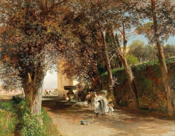 Curator: Here we have "Quai Aux Fleurs," an undated oil painting by Alfred Stevens. Immediately striking, wouldn't you say? Editor: Absolutely. There's this gentle, almost dreamy quality, a certain haziness that hangs over the cityscape. It's as if the scent of the flowers themselves is blurring the edges. Curator: Yes, a sensory haze. The composition is carefully structured, note the placement of the figures along the pathway, drawing the eye toward the distant bridge. The juxtaposition of the structured urban landscape with the riotous colours of the flower stall provides a rather compelling semiotic interplay. Editor: True, there is a very solid visual structure but the way Stevens captured that fleeting moment… Those soft colours and light feel ephemeral like they're about to vanish any second now, to change ever so slightly depending on the sun. That is an artist being present in the instant! Curator: Precisely, the brushstrokes themselves seem to mimic the transience. Notice the broken colour technique, the deliberate fragmentation of light and shadow to convey a sense of atmospheric reality. It's pure Impressionist visual strategy at play. Editor: All these fine words! I just think it is really lovely: imagine just strolling along there, taking it all in... Curator: Beyond its pure aesthetic pleasure, the work speaks to the rise of the flâneur, that quintessential observer of urban life. The painting invites us to consider our own relationship to the evolving modern landscape and how the painter mediates experience. Editor: All of these paintings help us freeze time, which gives a voice to moments we might have simply passed through and would otherwise have been lost in its fleeting nature. Curator: A resonant point indeed. We see how Stevens' canvas is not simply representational. It actively participates in shaping our cultural perceptions of that historical milieu and urban experience. Editor: Yes. I can appreciate the painting for being there and for reminding me that every ordinary instant has poetry. I have found peace with this thought, what about you? Curator: An adequately insightful moment for us both. Indeed, in dissecting Stevens’ craft, we not only decode the artwork’s visual language but understand, too, that historical sensibility which transcends paint itself.