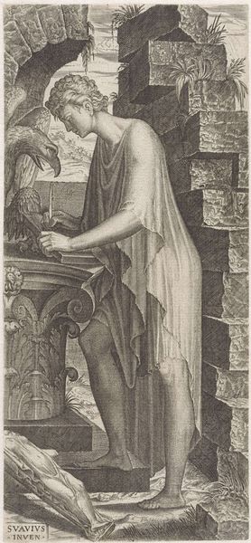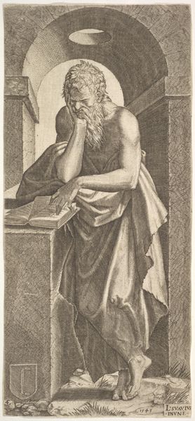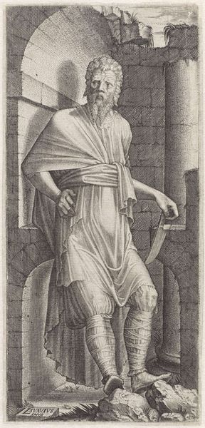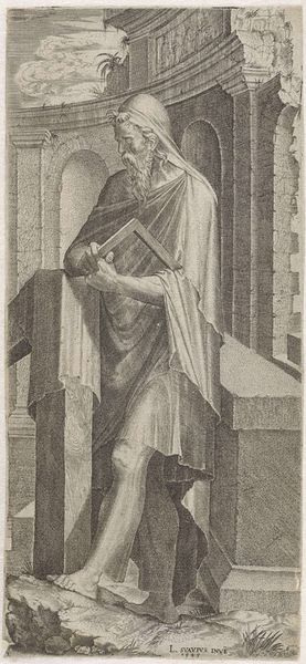 Lambertus Suavius created this engraving of Apostel Filippus in the mid-16th century, a time of religious upheaval and artistic innovation in Europe. The image presents a figure who bears the marks of both classical antiquity and the weight of religious conviction. Filippus is depicted with the muscularity of a classical statue, yet he is draped in robes that hint at both modesty and the exotic. The turban and bare feet suggest an intersection of cultures and identities, placing him in a space between the familiar and the foreign. Suavius was working during the Reformation, a period when the representation of religious figures was fraught with political and theological implications. Consider how Suavius navigates these tensions. Does he offer a traditional representation of a saint, or does he propose an alternative narrative, one that challenges the established norms of religious art and identity? This image invites us to reflect on the complex interplay of faith, culture, and artistic expression during a pivotal moment in European history.