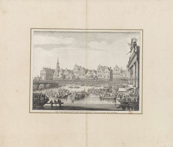 Editor: This etching from 1769, after an earlier depiction by Simon Fokke, is titled "Koppermaandag met leprozenoptocht te Amsterdam, 1604," or "Copper Monday with a leper procession in Amsterdam." It looks like it represents a bustling cityscape scene. What can you tell me about it? Curator: This image, while seemingly documenting a historical event, demands that we investigate its socio-political context. The leper procession wasn't simply a quaint tradition. Consider who is being paraded, and who is watching. Is this depiction empowering or exploitative? How might power dynamics have shaped this event, and how are they reinforced in this visual record? Editor: That's a fascinating way to look at it. So, it's less about historical accuracy and more about the statement it makes? Curator: Exactly. It's a performance. Who has the power to represent whom? The etching was made long after the event took place, so we have to ask about its reception during the 18th century, during the Dutch Golden Age. What message was Simon Fokke, a relatively successful artist at the time, conveying, and to what end? It could be said this parade provided a stage on which societal anxieties around health, morality, and difference were played out. Editor: Wow, I didn't think of it that way at all. So even seemingly innocuous images can have complex layers of meaning related to power and representation. Curator: Precisely! It forces us to question not just what we see, but why, and for whom. Looking at this through the lens of disability studies reveals the way that society and historical artwork treated, and perhaps still see people with any handicap. Editor: This has definitely given me a new way to examine historical artworks. Thank you.