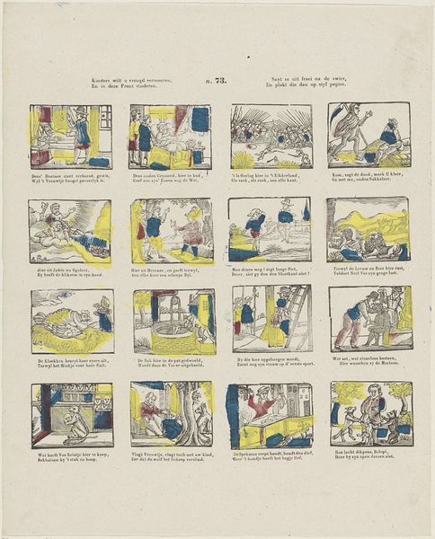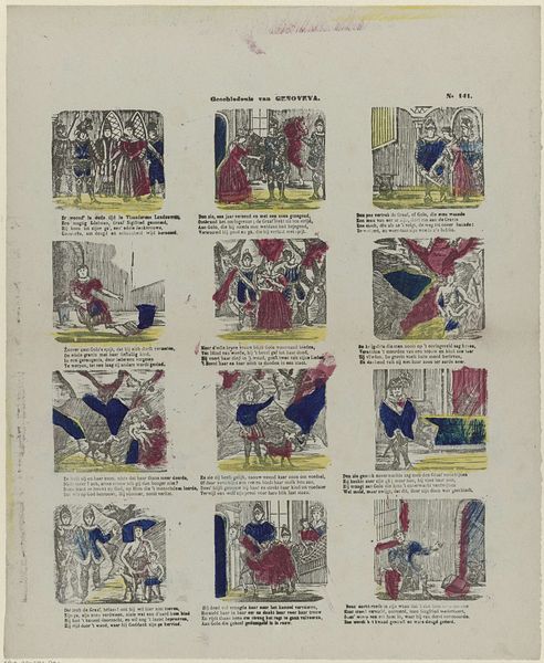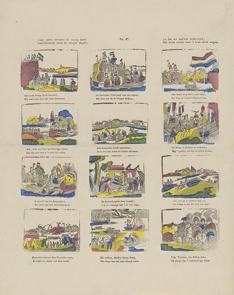 Curator: Let's explore this lithograph and engraving from the Rijksmuseum’s collection titled "Wat onder 't Spaansche juk Oud-Holland heeft geleden," created between 1848 and 1881 by Lutkie & Cranenburg. Editor: It’s interesting; almost like an early comic strip recounting history. There’s a narrative quality to the individual images. What historical lenses can we use to interpret this work? Curator: Considering its creation in the mid-19th century, it's crucial to understand this piece as a reflection of Dutch national identity formation. It presents a retrospective view of the struggle against Spanish rule. Each scene acts as a piece of visual propaganda, reinforcing a particular narrative about Dutch resilience and the fight for freedom. Editor: Propaganda, really? It seems... quaint for such a loaded term. Curator: But think about the power dynamics at play here. Who gets to tell the story? Who is centered in this narrative of liberation? Consider the potential silences and erasures. Do we see the perspectives of the colonized or those marginalized within Dutch society? The work celebrates a very specific kind of freedom. Editor: That’s a really interesting point. It reframes my initial impression completely. So instead of just seeing it as a historical record, we need to question its motivations. Curator: Precisely. The selective color and simplistic depictions are calculated choices serving a nationalist agenda. By analyzing the absences, we understand how history is wielded as a tool for shaping collective memory. What questions does this raise for you about contemporary historical representations? Editor: Wow, it gives me a lot to consider. The print appears to be a fairly simple historical depiction, but it reflects much larger concerns about national identity and historical narrative. Curator: Indeed. This deeper dive into visual representation teaches us to look critically at all historical accounts.
