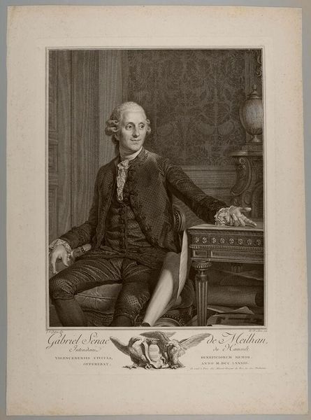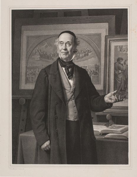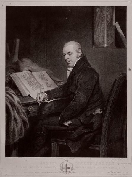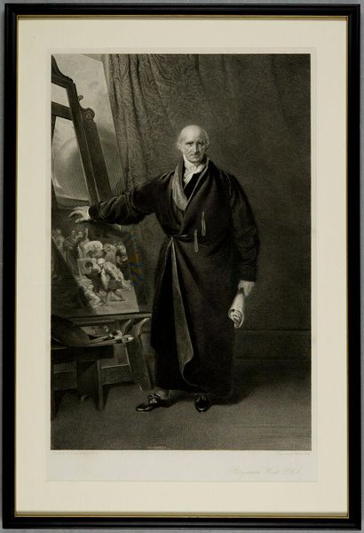 Editor: This is Charles Rolls' "Portrait of Benjamin West." Rolls was born in 1799. The details are incredible. What strikes you most about the composition? Curator: The interplay of textures commands attention. Consider the contrast between the smooth, almost porcelain quality of West’s face and the rough, unfinished canvas beside him. Editor: It’s a striking juxtaposition. Curator: Indeed. Note also the artist's command of chiaroscuro, creating depth and volume. The draped fabric in the background provides a textural counterpoint. What does the artist intend by these contrasts? Editor: Perhaps to emphasize the subject's role as both creator and intellectual? Thank you for guiding me through it. Curator: A rewarding analysis. It speaks to the complexities inherent in portraiture and representation.