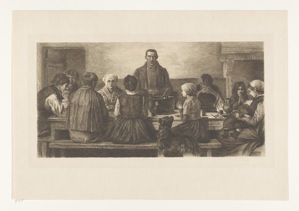 Curator: What a scene Louise Danse has presented to us in her etching from 1895, "Family at the table praying before the meal," held right here at the Rijksmuseum. It has this tender intimacy doesn't it? Almost like witnessing a fleeting, sacred moment. Editor: Fleeting and sacred perhaps, but what strikes me immediately is how constructed this intimacy feels. The table dominates the foreground, everyone meticulously placed, all knees fitting almost robotically. It reads like a tableau staged for some kind of social observation. Curator: Interesting! I saw it more as genuine. I felt it pulled back the curtain into a modest home, and I could practically smell the warm stew simmering in that pot on the table! Look how they bow their heads. Do you feel that almost protective gesture encompassing the family unity? Editor: Protective? I see labor etched onto their faces! That's a large gathering—the production involved is palpable! How much food? How were these clothes made, then threadbare, handed down? Where is the industry around this humble table, I ask. This artwork seems preoccupied with romanticising the idea of piety over examining lived realities. Curator: Fair, it's undeniably romanticised. It draws from that almost Medieval aesthetic with the heavy linework, and I think that's the charm. But there's also realism. Like in that dog in the foreground. So very alert, as if he might snarf a dropped scrap the second prayer is over. Editor: Ah, but what IS that pot made of? The linework renders a blurred view—steel, iron? Was it crafted locally? Or purchased from afar and who made THAT table. I look closer at each tool and I want to know what hands produced that tool for that family. It gives so much greater of the actual family context. Curator: The etching almost feels like a snapshot. That single moment stretches into something timeless. It's also genre painting, isn’t it? One slice of daily life immortalized. Editor: For me, the emphasis is on the 'etching' itself. How the print medium democratises image distribution, brings such scenes, however stylised, into more homes. The production itself becomes meaningful. I find myself wondering what would this very family has thought of the printed image portraying themselves to strangers Curator: Hmm, perhaps, maybe it would give them pride? What a lasting monument they'd have over their lives, immortalised and celebrated in our here in Rijksmuseum. A small act of kindness or appreciation captured in black and white, and a slice of what their version of a ‘holy’ life looked. Editor: The means by which this "slice" reaches us is more vital, in a way, than the flavour offered, you see?